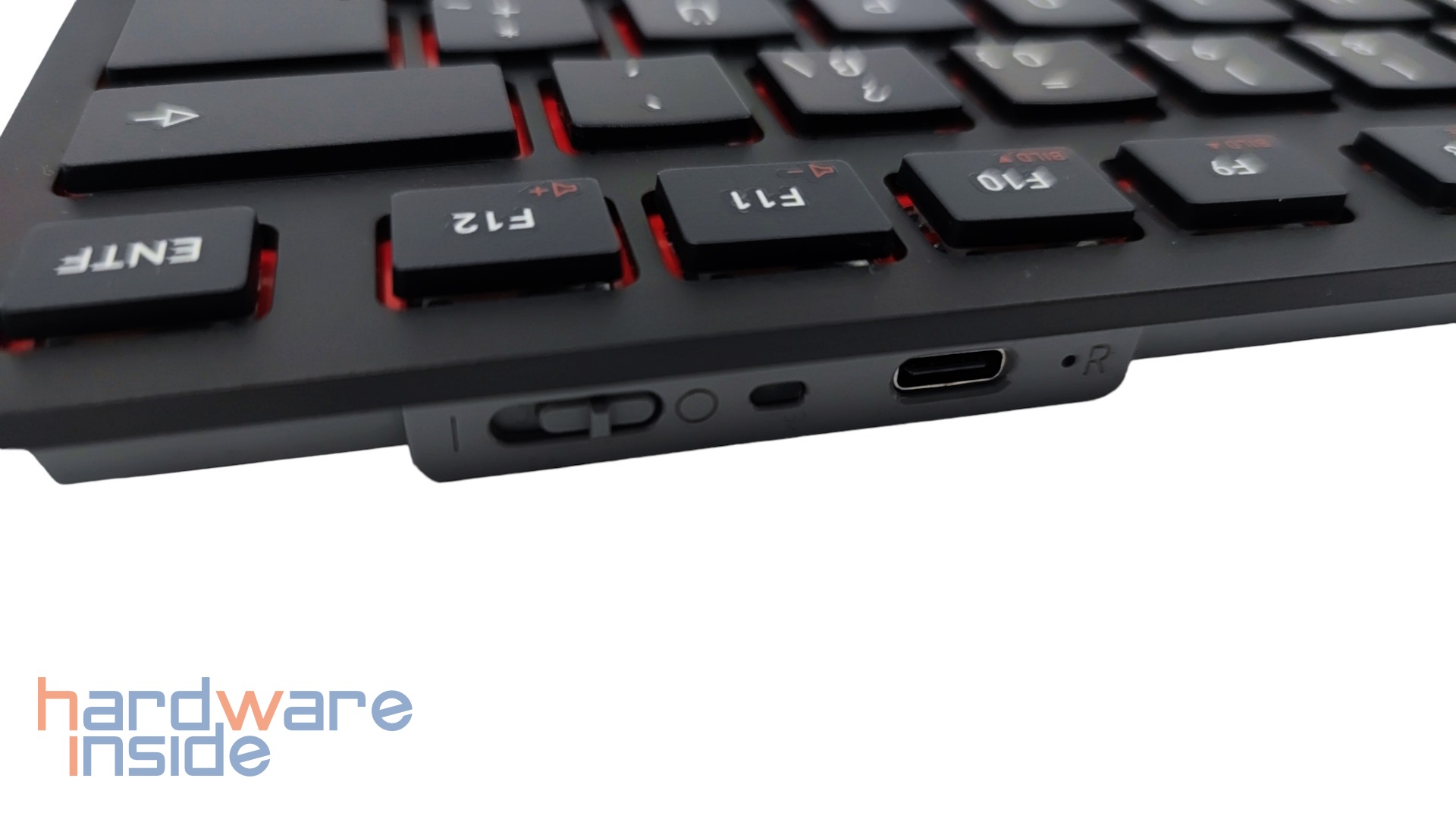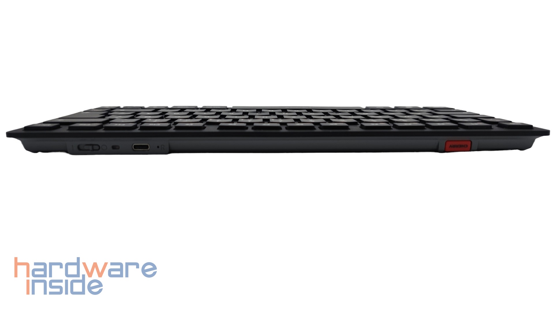 Mit nur 15,86 mm ist die Tastatur sehr flach. Dennoch reicht es aus, um einen Platz für den USB-Funk-Dongle auf der Rückseite zu schaffen. Der Dongle ist auch hier farblich in Rot abgesetzt, sodass sich ein guter Kontrast zur schwarzen Tastatur gibt. Der USB-Dongle haftet magnetisch in seiner Aussparung. Auf der gegenüberliegenden Seite der Rückseite befindet sich ein Schalter zum Ein- bzw. Ausschalten der Tastatur. Daneben sind der USB-Anschluss, eine Status-LED für den Akkuladezustand und ein Reset-Taster angeordnet.