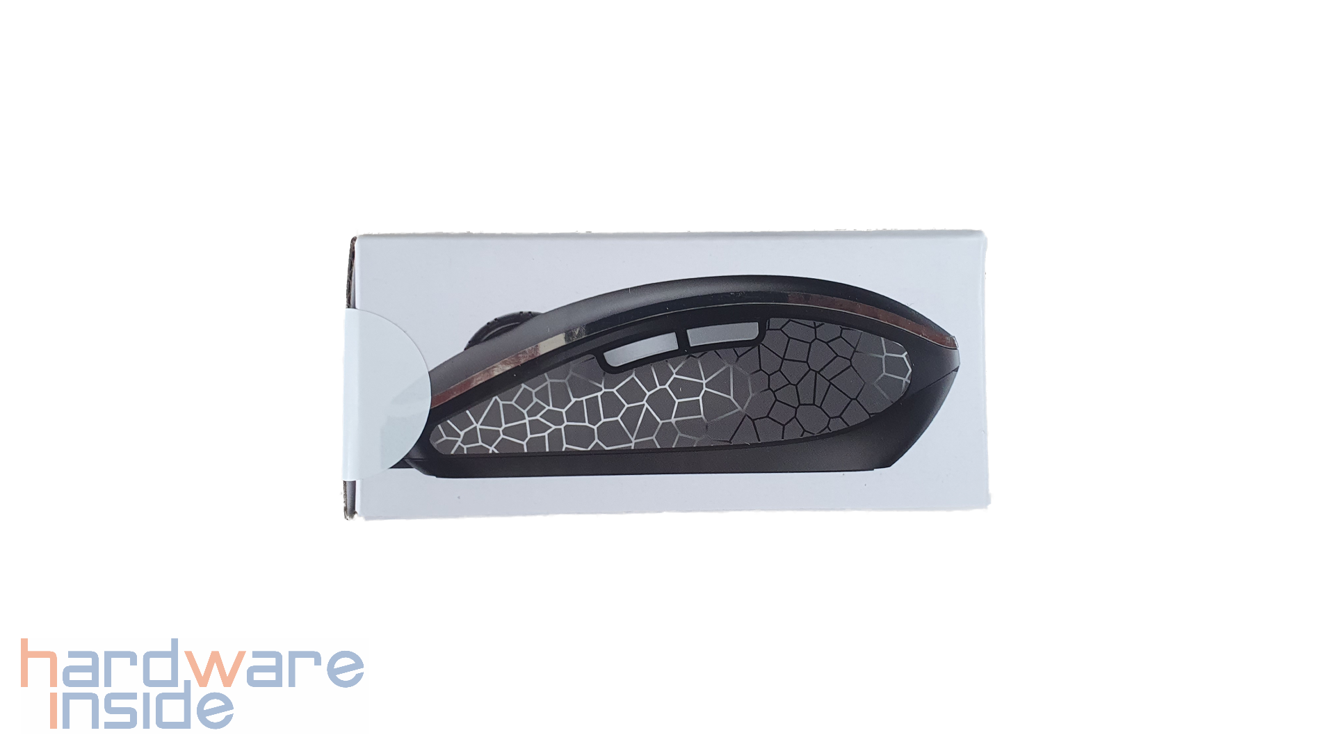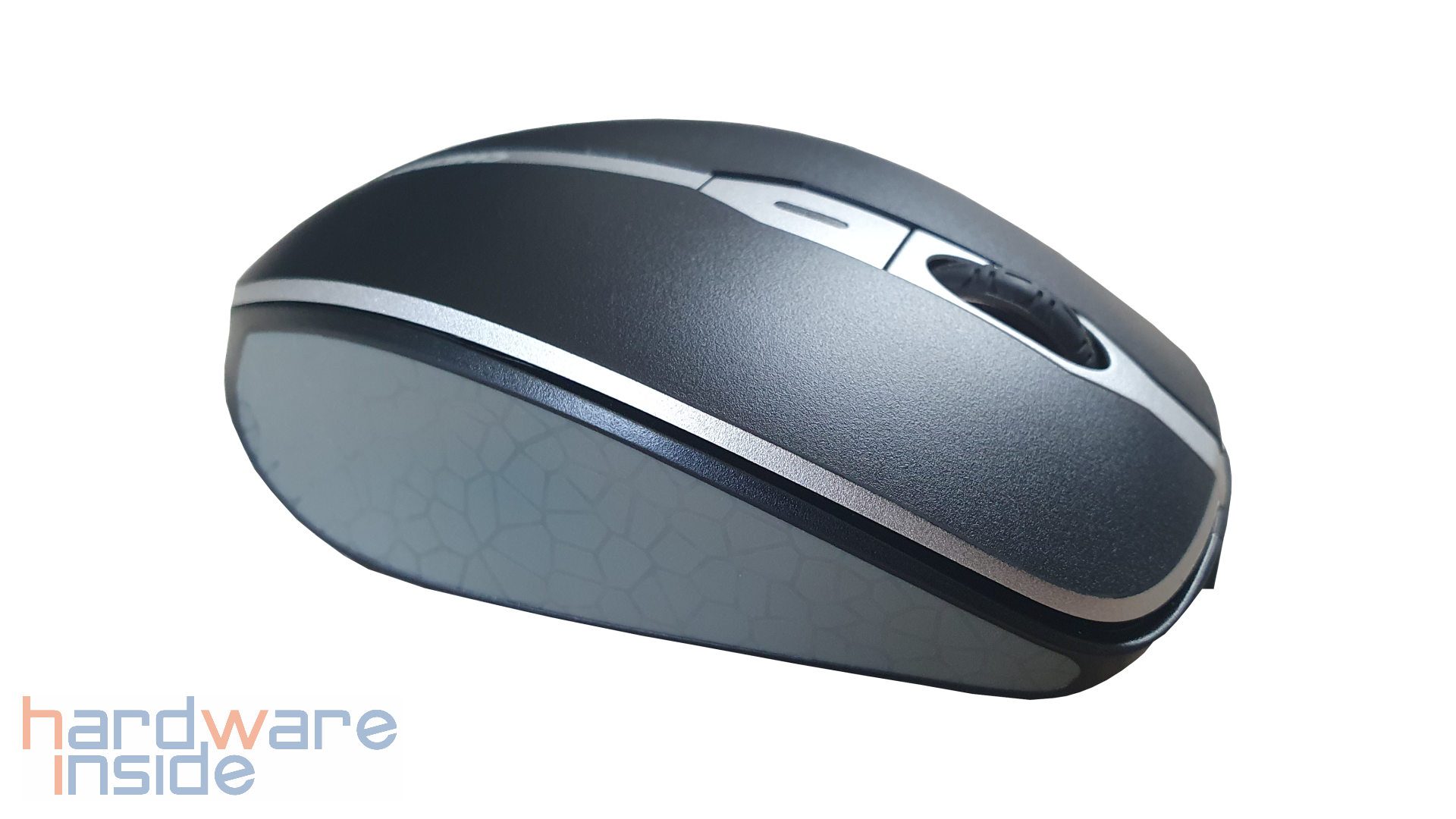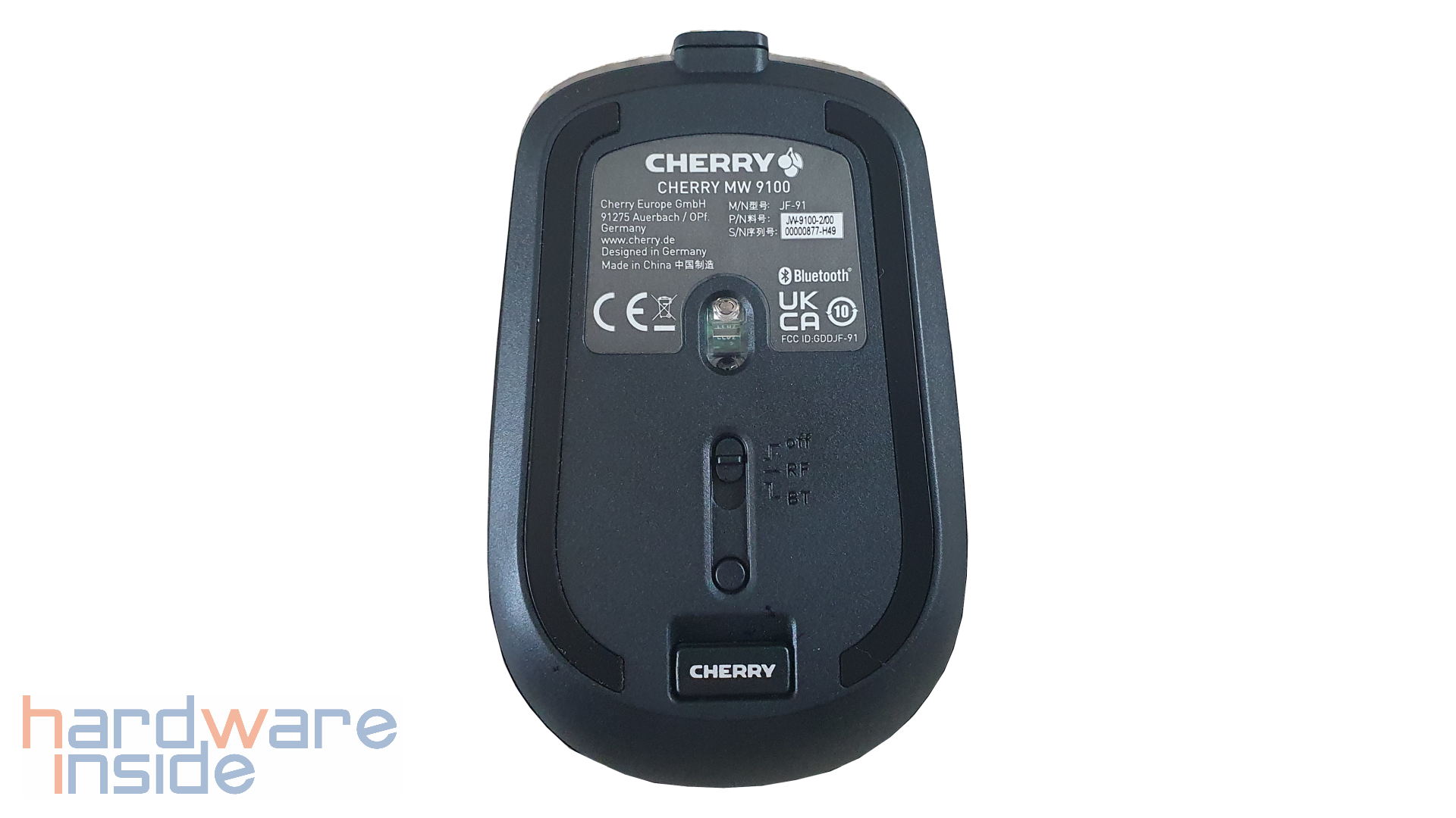 Der Rand der Oberfläche und die Daumentasten sind silberfarben. Der Rand auf der Unterseite ist nahezu vollständig mit einer gleitenden Oberfläche bedeckt. Unterhalb befindet sich der USB-Signalempfänger, der angenehm magnetisch fixiert ist. Über dem Empfänger ist eine kleine Taste, die die aktuelle Verbindung aktualisiert und eine neue Verbindung zu einem Gerät aufbaut. Über diesem Taster befindet sich ein Schalter, der zwischen „Aus“, „RF“ oder „BT“ – Modus umschaltet. Oben in der Mitte ist der Maussensor mit einigen allgemeinen Informationen angebracht.