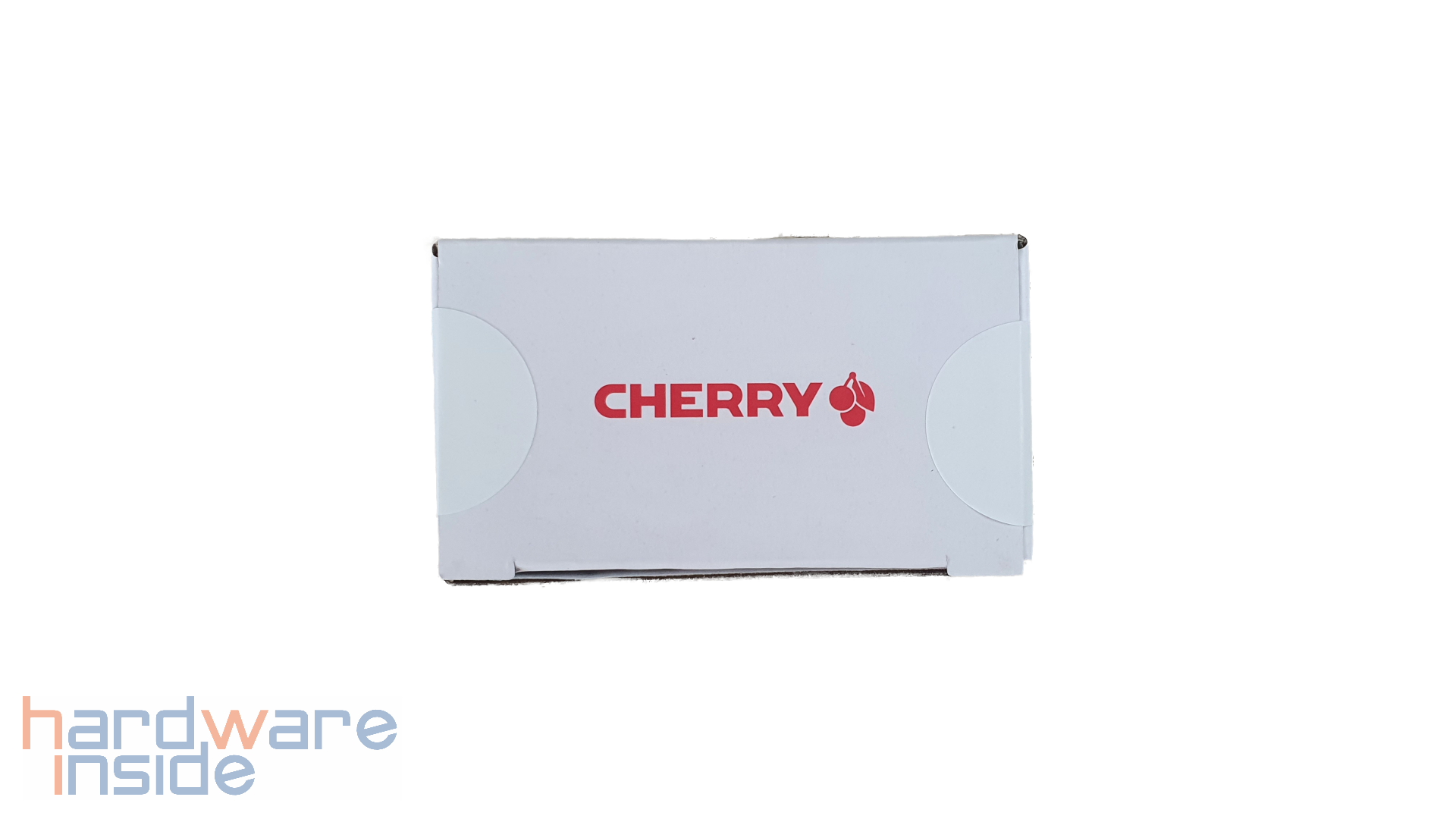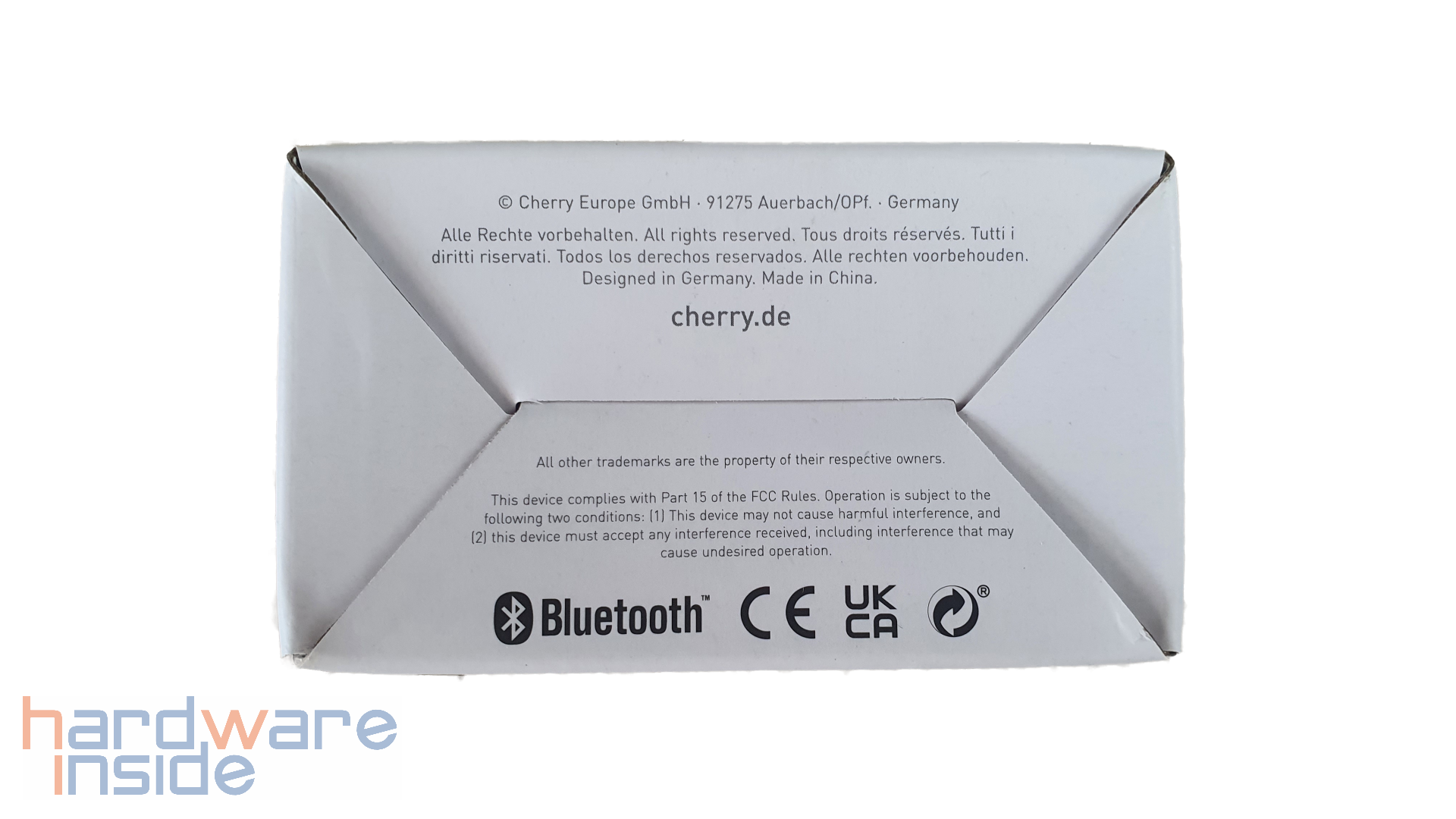 Die Verpackung ist weiß gehalten und besitzt ein platzsparendes Design. Auf der Vorderseite ist die Maus mit dem Signalempfänger aus der Vogelperspektive zu erkennen. Die Linke Seite der Verpackung zeigt die CHERRY MW 9100 im Profil. Auf der oberen Seite ist das Cherry Logo in Rot abgebildet. Während auf der Unterseite Informationen über die Cherry GmbH zu finden sind, gibt es auf der Rückseite eine kurze Sammlung der Features in verschiedenen Sprachen.