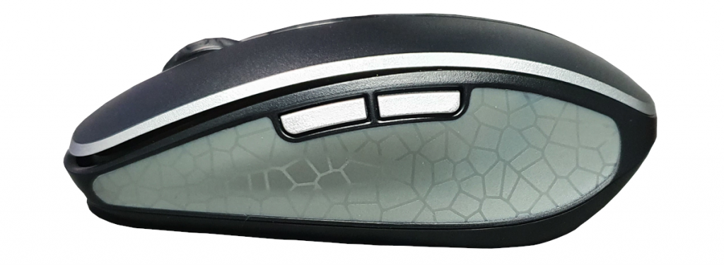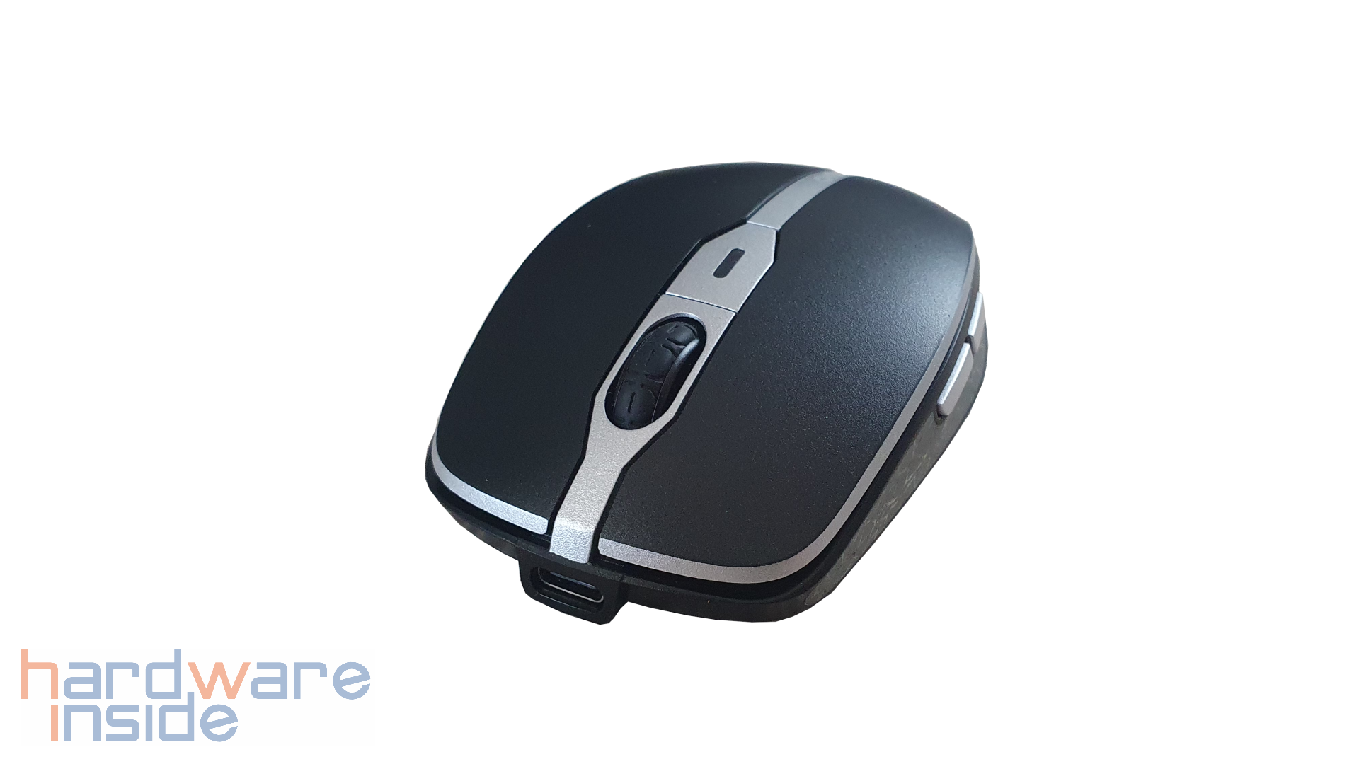 Der Rand der Oberfläche und die Daumentasten sind silberfarben. Der Rand auf der Unterseite ist nahezu vollständig mit einer gleitenden Oberfläche bedeckt. Unterhalb befindet sich der USB-Signalempfänger, der angenehm magnetisch fixiert ist. Über dem Empfänger ist eine kleine Taste, die die aktuelle Verbindung aktualisiert und eine neue Verbindung zu einem Gerät aufbaut. Über diesem Taster befindet sich ein Schalter, der zwischen „Aus“, „RF“ oder „BT“ – Modus umschaltet. Oben in der Mitte ist der Maussensor mit einigen allgemeinen Informationen angebracht.