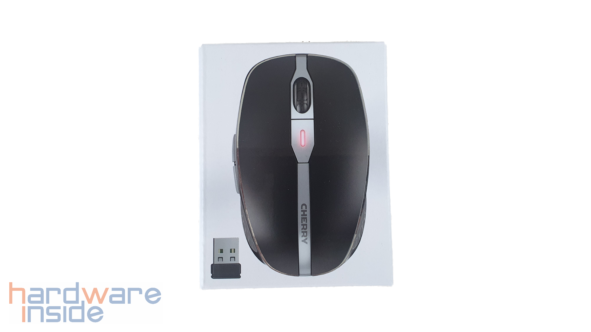 Die Verpackung ist weiß gehalten und besitzt ein platzsparendes Design. Auf der Vorderseite ist die Maus mit dem Signalempfänger aus der Vogelperspektive zu erkennen. Die Linke Seite der Verpackung zeigt die CHERRY MW 9100 im Profil. Auf der oberen Seite ist das Cherry Logo in Rot abgebildet. Während auf der Unterseite Informationen über die Cherry GmbH zu finden sind, gibt es auf der Rückseite eine kurze Sammlung der Features in verschiedenen Sprachen.