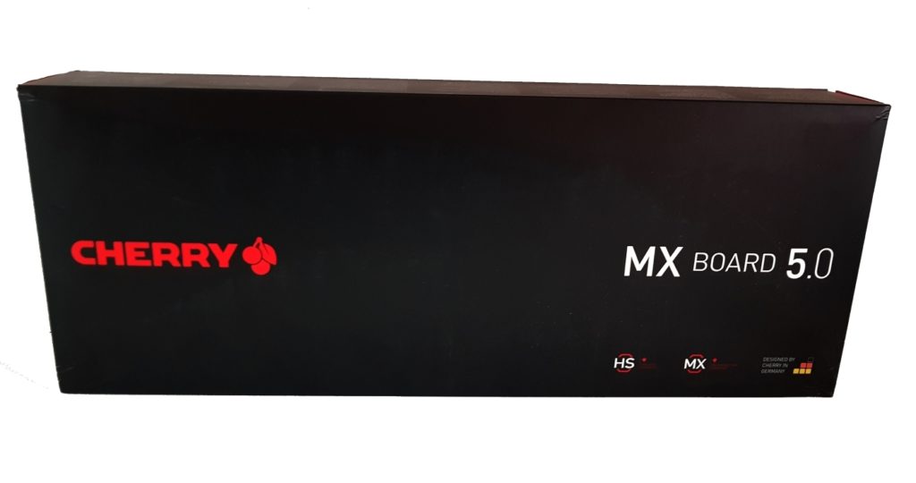 Das Cherry MX Board 5.0 kommt in einem schlichten, schwarzen Karton. Auf der Vorderseite ist das Cherry Logo in roter und die Modellbezeichnung in weißer Schrift abgedruckt. Auf der Rückseite befindet sich eine Abbildung der Tastatur, sowie die wichtigsten Features der Tastatur in Kurzform. An der Unterseite sind die Features mehrsprachig und ausführlicher aufgedruckt. An der linken Seite sind Aufkleber angebracht auf denen zum einen die Seriennummer und zum anderen die verbauten Switches ausgewiesen sind.