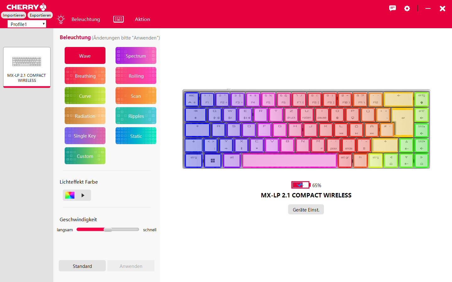 Ist die Cherry MX-LP 2.1 schon im ausgeschalteten Zustand ein schönes Stück Technik, so verstärkt sich dieser Eindruck beim Einschalten der Beleuchtung noch einmal. Da es sich hier um ein recht helles Material handelt, wirkt die Beleuchtung noch mal um einiges kräftiger, als dies bei dunklen Tastaturen der Fall ist. Die Beschriftung ist jetzt noch einmal etwas besser ablesbar und die Tastenkappen wirken, als wenn diese über dem Gehäuse schweben. Die Beleuchtung lässt sich auf jeder Taste beliebig anders konfigurieren, es sind aber auch schon sehr viele Effekte zur Auswahl vorhanden.
