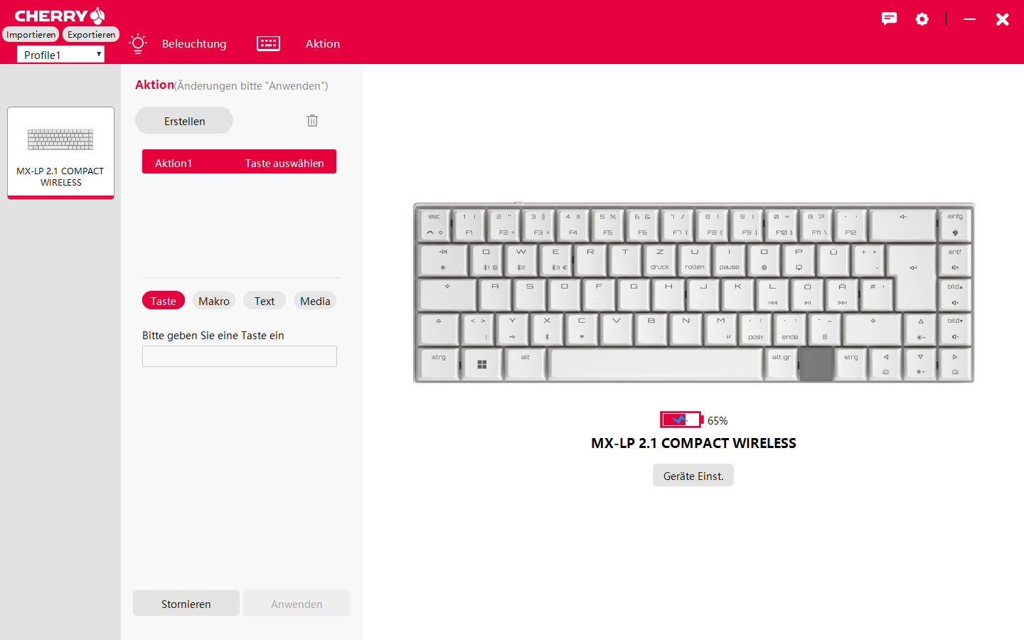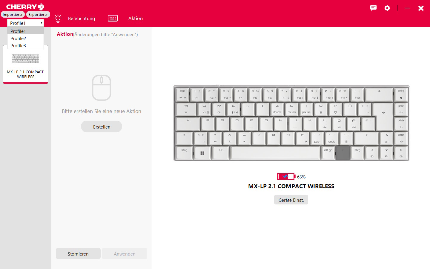 Cherry bietet auch eine Software zur Tastatur an, dabei handelt es sich um die „CHERRY Utility“ Software. Diese beinhaltet Möglichkeiten der Individualisierung von Beleuchtung, Tastenbelegung und dem Erstellen von Makros. Zudem wird uns in der Übersicht der Software auch der aktuelle Ladezustand und der Status des Ladens angezeigt. Die Software ist übersichtlich gestaltet und einfach zu bedienen. Die Software nimmt im installierten Zustand rund 66 MB Speicherplatz ein. Viele Funktionen lassen sich aber auch ohne Software über Tastenkombinationen erledigen.