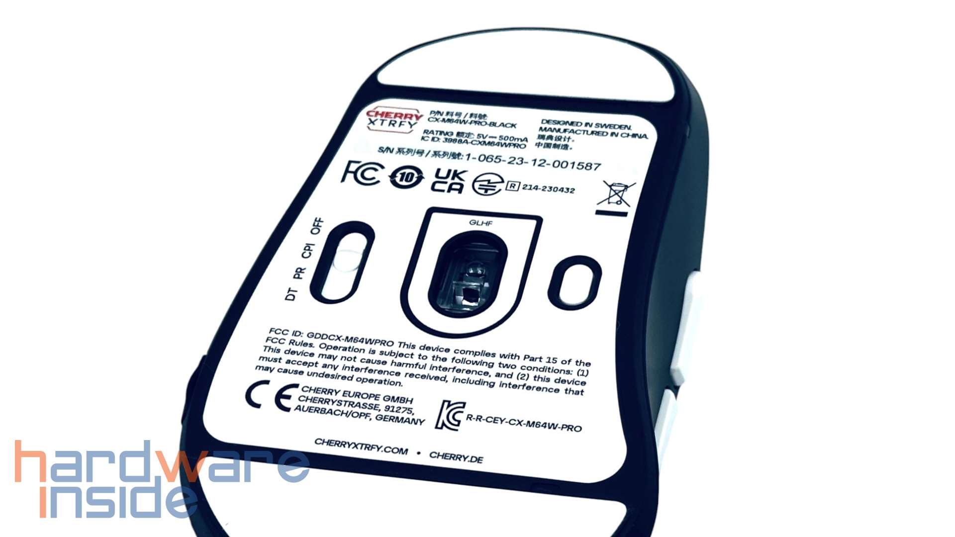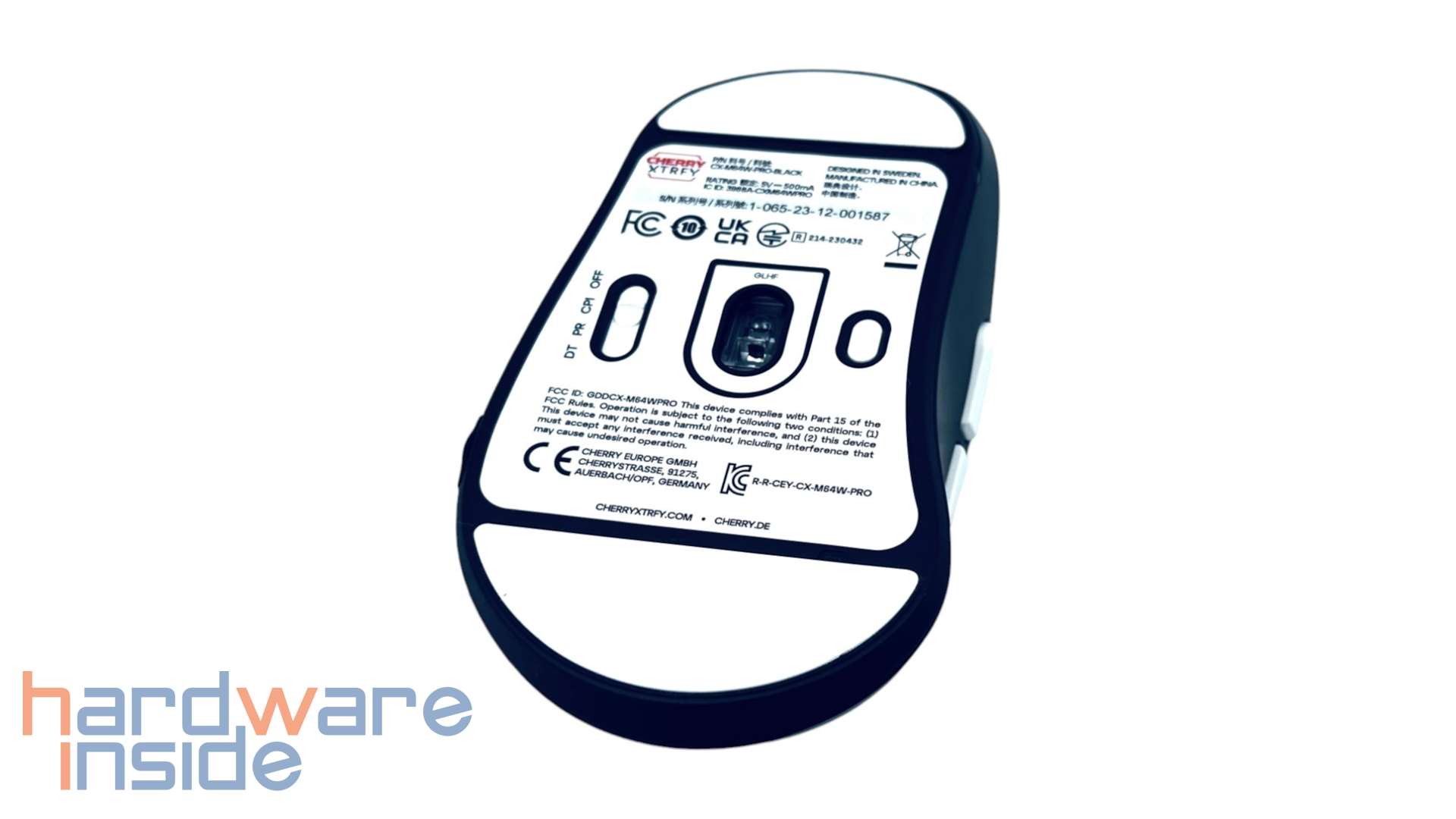 Nun geht es an die Unterseite der CHERRY XTRFY M64 Pro Wireless. Hier sind großzügig dimensionierte Gleitfüße aus weißem PTFE zu sehen. Im mittleren Bereich ist der Sensor angeordnet, welcher links von einem Schiebeschalter und rechts von einer Taste flankiert wird. Der Aufkleber, welcher sich über einen großen Teil der Mitte erstreckt, finden sich einige technische Informationen sowie sehr kurze Erklärungen zu Bedienung.