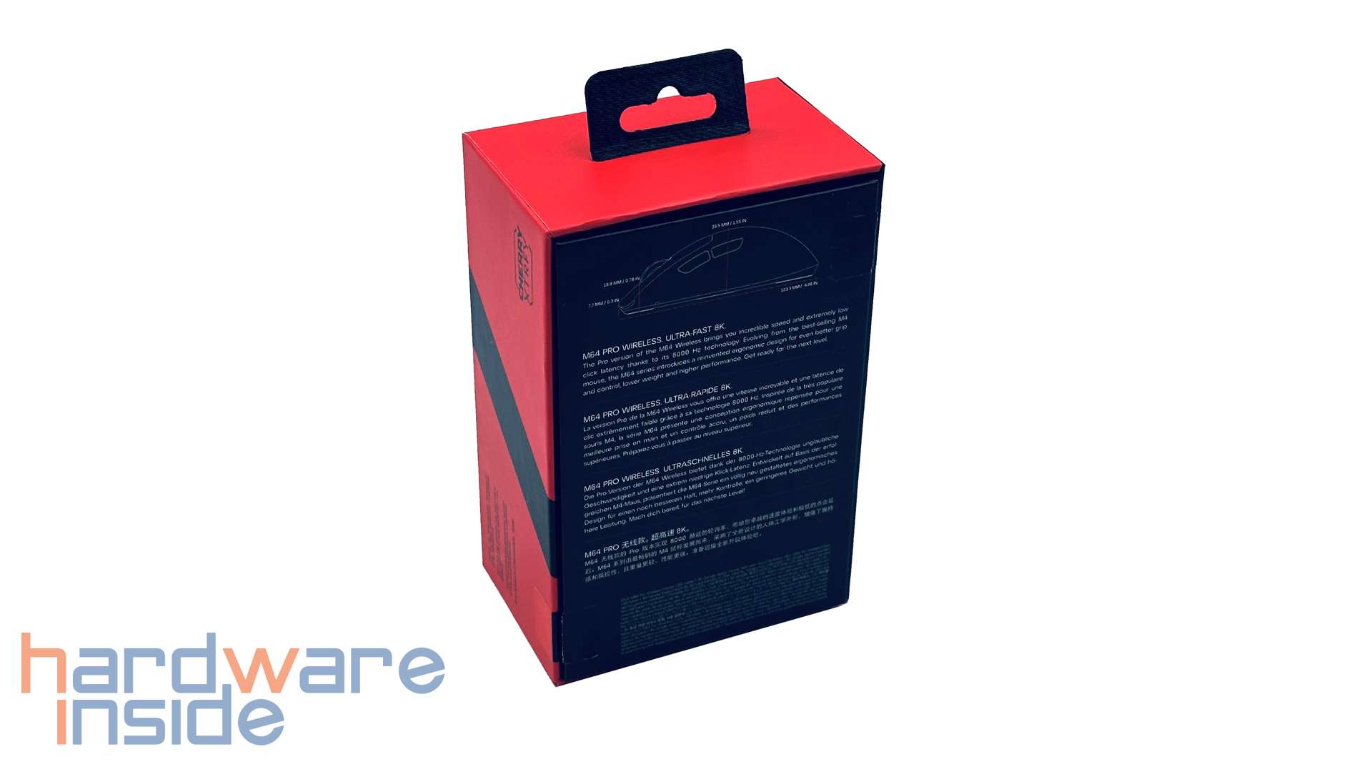Die Verpackung der CHERRY XTRFY M64 Pro Wireless Maus ist in einem auffälligen Design gestaltet, das hauptsächlich in den Farben Schwarz und Rot gehalten ist. Die Vorderseite der Verpackung zeigt eine Abbildung der Maus. In der oberen linken Ecke befindet sich der Modellname und in der oberen rechten Ecke ist ein kleines, graues Quadrat, was auf die hohe Polling-Rate der Maus hinweist. Auf der Vorderseite der Verpackung ist außerdem das CHERRY Xtrfy-Logo in Weiß und Rot zu sehen.