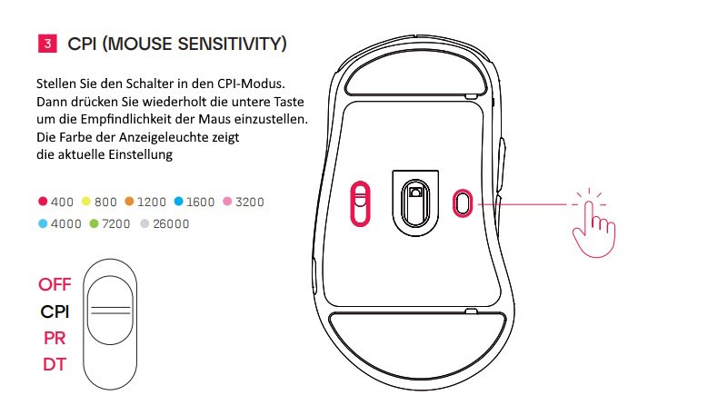 Wer zu vor noch nie eine Maus von CHERRY XTRFY hatte, der sollte unbedingt einen Blick in die Bedienungsanleitung werfen. Die Auflösung der CHERRY XTRFY M64 Pro Wireless lässt sich, wie bereits vermutet, durch die Bedienelemente auf der Unterseite der Maus einstellen. Dazu wird der Schieberegler auf „CPI“ gestellt – anschließend kann man über die Taste (rechts vom Sensor) durch die einzelnen Auflösungen schalten. Dabei sind lediglich die vordefinierten Auflösungen wählbar, eigene Auflösungen sind nicht möglich. Immerhin gibt es gleich acht vordefinierte Auflösungen von 800 bis 26.000 DPI. Neben der Auflösung lassen sich so auch die Polling-Rate, Debounce Time und Lift-Off Distanz einstellen.