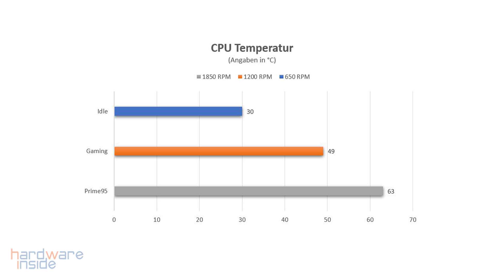 Die Temperaturen sind für uns natürlich auch ein wichtiges Kriterium, daher testen wir mit Prime95 die 1344k ohne AVX. Die Lüfter wurden so kalibriert, dass eine ausreichende Kühlleistung vorhanden ist. Da die vier 120 mm A-RGB Rainbow-Lüfter über den HUB gesteuert werden, wurden sie manuell so eingestellt, dass genug Performance und Leistung anliegt (Empfindung) und genug Luftzirkulation vorhanden ist. Die verbauten Lüfter des Tower-Kühlers wurden so konfiguriert und eingestellt, dass wir einen guten Mittelwert aus Leistung und Performance vorfinden. Nach 30 Min. unter Last mit 1850 U/min. lagen wir bei Prime95 bei guten 63 °C. Unsere verbaute GTX 1060 war während unserer Testphase und 45 Min. Spielzeit in Forza Horizon 5 mit 42 Grad doch recht kühl, unsere eingestellte Lüfterkurve brachte die Karte sowie das Gesamtsystem nicht einmal zum Schwitzen. Wir denken, die Werte sprechen für sich. Die von uns erreichten Werte sind Ist-Werte und können natürlich abweichen, je nach verbauter Hardware und Kühlung. Das CHIEFTEC STALLION 3 ist rundum ein klasse Gehäuse, die vier verbauten 120 mm A-RGB Rainbow-Lüfter schaufelten die entstandene Abwärme, wie es sein muss nach draußen.