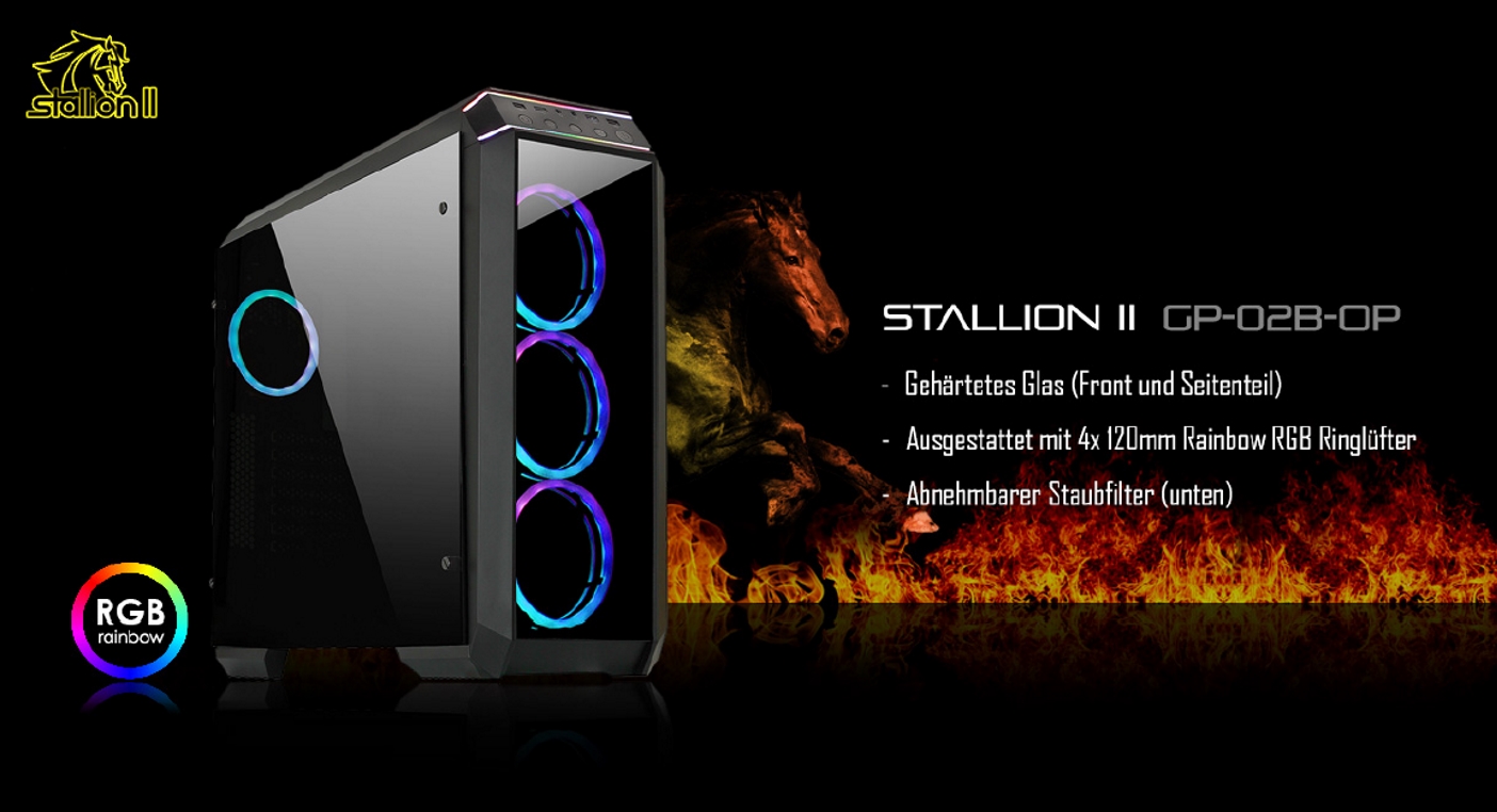 Das STALLION II ist ein Premium-ATX-Gaming-Tower im bewährten CHIEFTEC Stallion-Design der zweiten Generation. Das linke Seitenteil und die Front sind aus gehärtetem, getönten Glas (temperedglass) gefertigt. Insgesamt 4x 120 mm Rainbow RGB Ringlüfter bieten ein Farbenspiel, das jedes Gamer-Herz höher schlagen lässt. Die Farbmodi lassen sich entweder über die mitgelieferte Fernbedienung steuern oder über das Bedienungselement an der Front. Die ausgeklügelte Innenarchitektur ermöglicht die Integration eines 360 mm Radiators in der Front. Dieses Gehäuse bietet die optimale Basis für eine kompromisslose High-End-Konfiguration. Das Gehäuse ist ab sofort erhältlich.