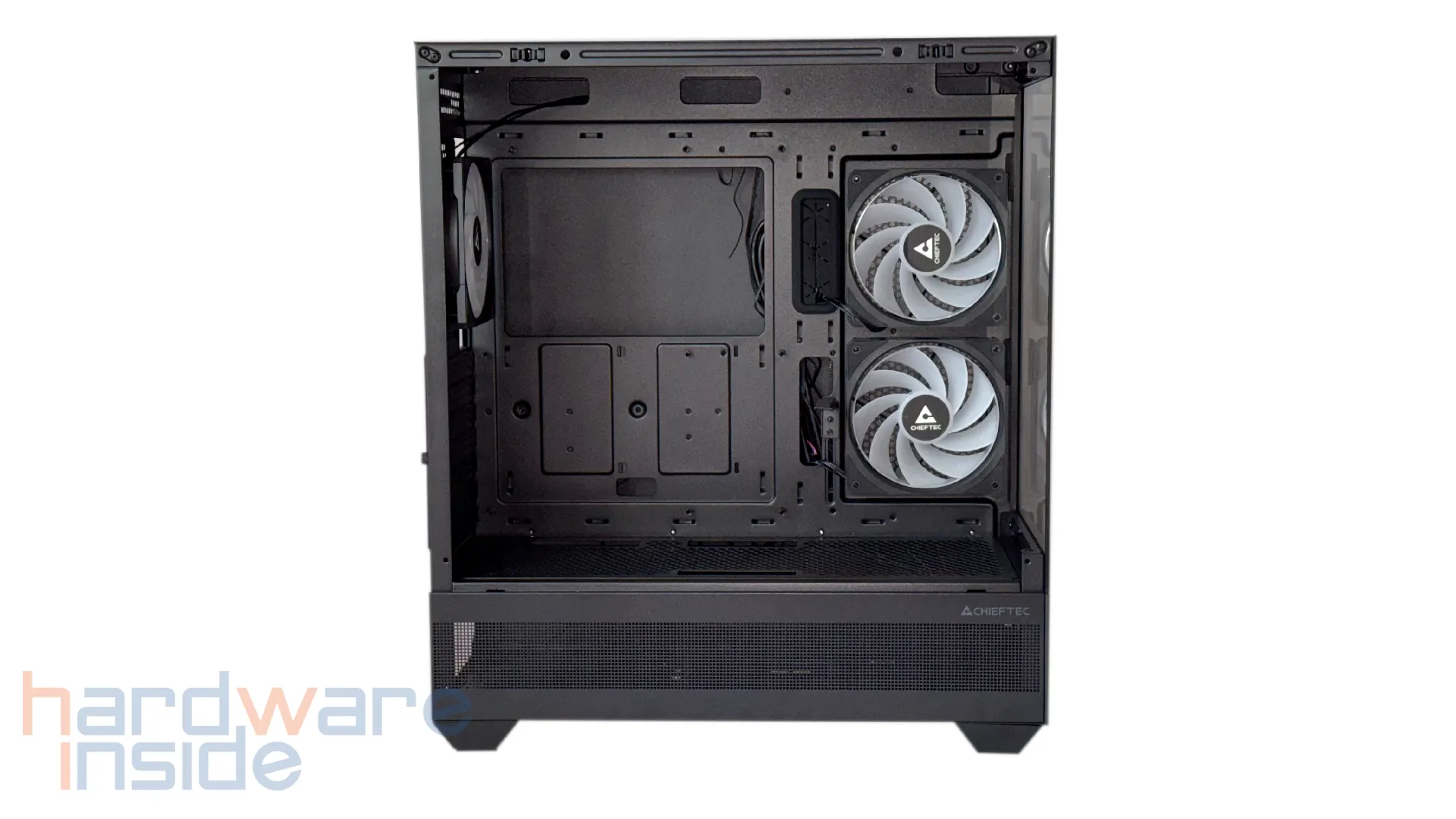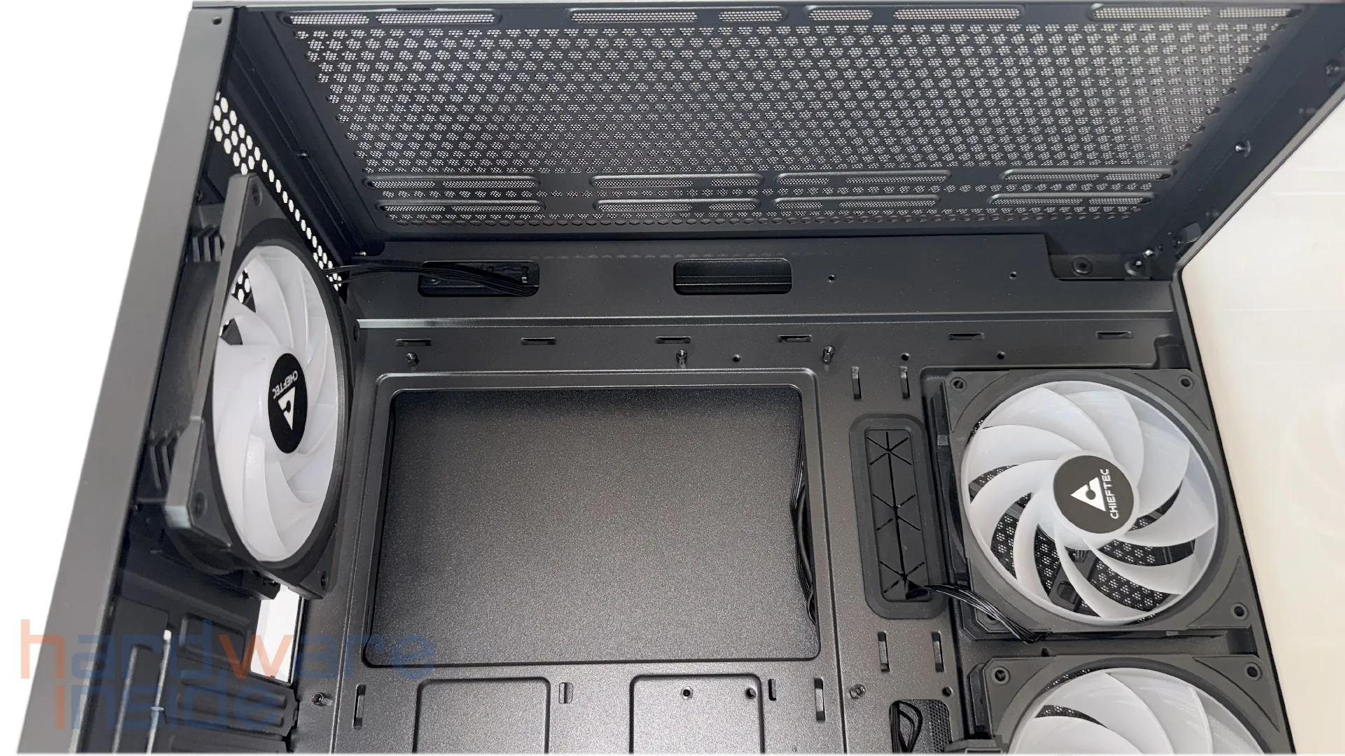 Ein weiterer Schwachpunkt: Das Gehäuse wird ohne Lüfter an der Oberseite ausgeliefert. Zwar gibt es dort Montagemöglichkeiten für drei weitere Lüfter oder einen Radiator, doch ohne aktive Abluft nach oben kann sich warme Luft unter dem Deckel stauen – besonders problematisch bei Tower-Kühlern, die nach oben abstrahlen.