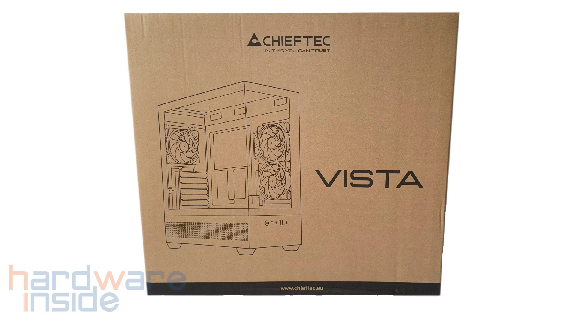 Das CHIEFTEC VISTA kommt in einem schlichten, braunen Karton mit schwarzem Aufdruck. Auf der Vorderseite prangt eine große Skizze des Gehäuses hervor, daneben der Produktname und das CHIEFTEC-Logo obendrüber. Die Rückseite zeigt hierbei genau dieselbe Darstellung. Der Karton selbst ist stabil und schützt das Gehäuse zuverlässig beim Transport.