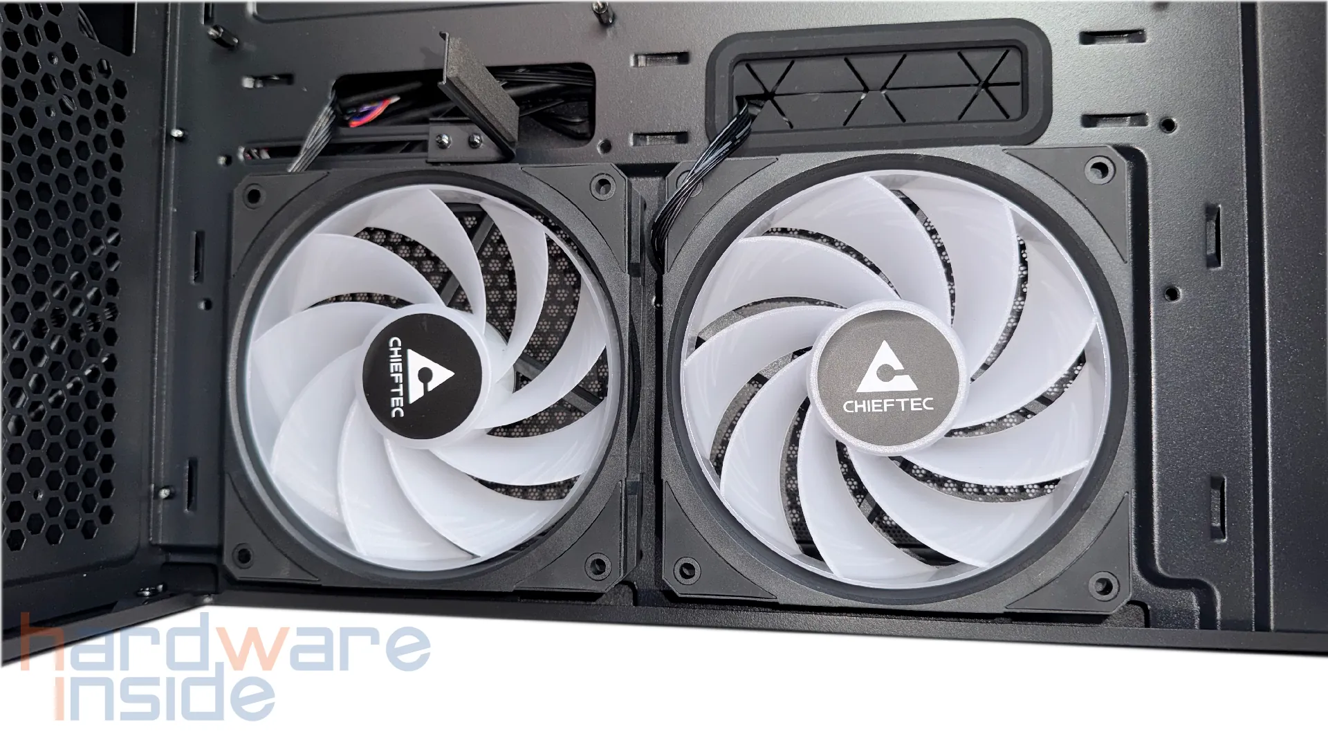 Das CHIEFTEC VISTA kommt ab Werk mit zwei vorinstallierten 120 mm reverese-blade ARGB-Lüftern in der Front und einem weiteren 120 mm ARGB-Lüfter an der Rückseite. Optisch machen die Lüfter einiges her: Die gleichmäßige Beleuchtung und die gut integrierte ARGB-Steuerung über das Mainboard sorgen für ein stimmiges Gesamtbild – gerade bei Sichtaufbauten mit Glasseiten und -front ein Pluspunkt.
