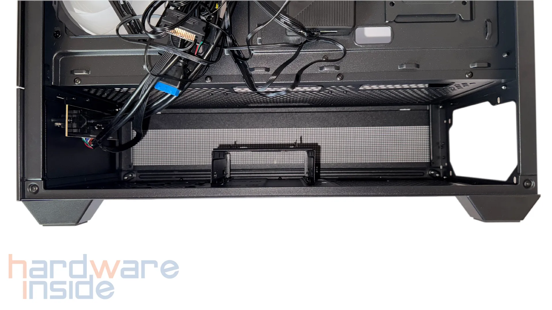 Im unteren Bereich des CHIEFTEC VISTA befindet sich eine abgetrennte Netzteilkammer, die das PSU optisch vom Hauptbereich trennt und für ein aufgeräumteres Erscheinungsbild sorgt. Das Netzteil selbst wird von der Seite eingeschoben und durch eine Blende verdeckt, was sowohl den Airflow verbessert als auch Kabelgewirr weitgehend versteckt.