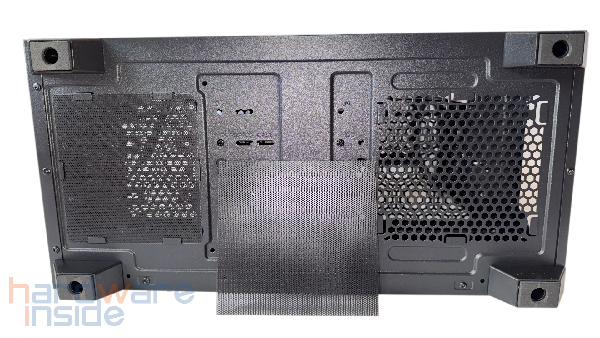 Auf der Unterseite finden sich vier gummierte Standfüße, die für ausreichende Stabilität sorgen, wenn auch die Gummierung etwas dünner ausfällt. Der PSU-Bereich ist mit einem einfachen, herausziehbaren Staubfilter versehen, der seinen Zweck erfüllt, aber keine besonders hochwertige Verarbeitung aufweist. Insgesamt liefert das Gehäuse hier eine zweckmäßige Umsetzung ohne große Innovationen – funktional, aber eher im soliden Mittelmaß angesiedelt.