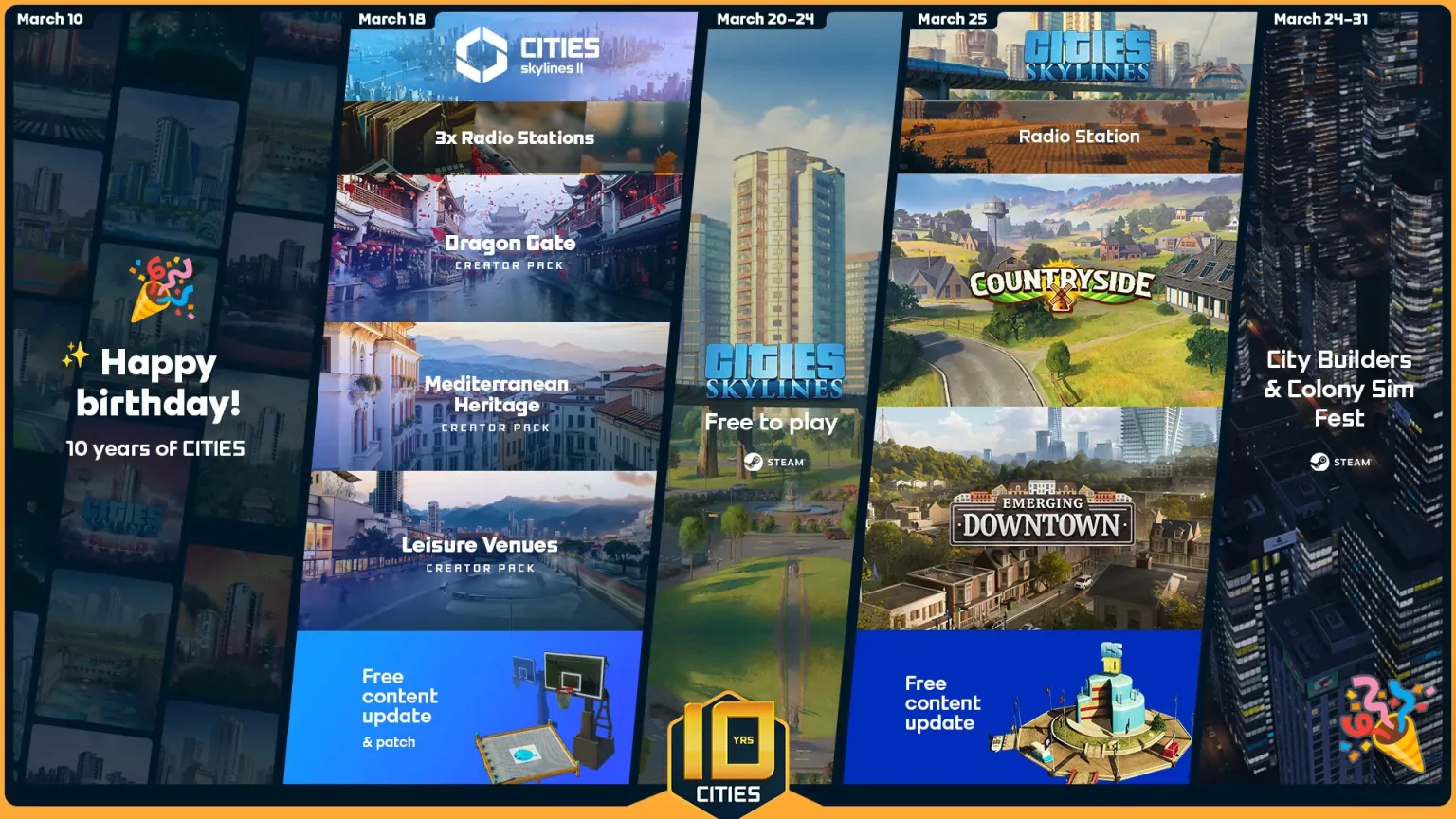 In der darauffolgenden Woche, am 25. März 2025, wird ein separater, kostenloser Jubiläumspatch zum ursprünglichen Cities: Skylines hinzugefügt, um das zehnjährige Bestehen der Community zu feiern. Mit diesem Patch werden dem Spiel dynamische Parks hinzugefügt, deren Aussehen sich mit den verschiedenen Erweiterungen, welche die Spieler dem Spiel hinzugefügt haben, verändert und somit eine persönliche Hommage an die einzigartigen Erfahrungen der Spieler mit Cities: Skylines darstellt. Am 25. März werden außerdem zwei Creator Packs und ein Radiosender veröffentlicht: