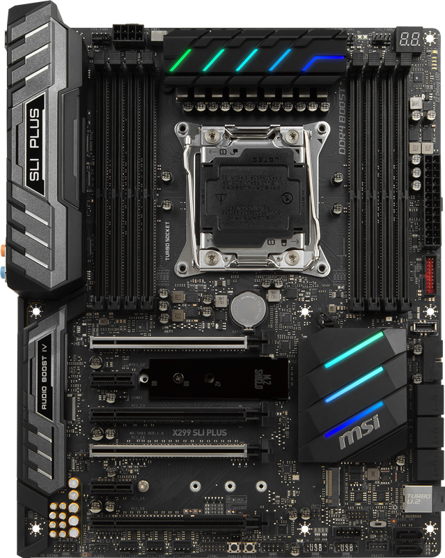 Das MSI X299 SLI PLUS richtet sich vor allem an Systemintegratoren und Business-Anwender. Das Motherboard ist auf Effizienz und Stabilität ausgelegt und mit Premium Dual Intel® LAN ausgestattet. Die Funktion optimiert die Datenübertragung durch Reduzierung des CPU Overheads und erreicht einen außergewöhnlich hohen TCP- und UDP-Durchsatz. Mit 15KV-Überspannungsschutz bietet das X299 SLI PLUS außerdem einen Zusatzschutz vor Blitzeinschlägen und statischer Entladung. Das MSI-exklusive System Saver Design unterstützt zudem einen reibungslosen Bootvorgang. Für maximale Datenübertragungsleistung und SSD-Unterstützung der neuesten Generation bietet das X299 SLI PLUS Turbo-U.2- und Twin-Turbo-M.2-Schnittstellen. Für hervorragende DDR4-Speicher-Kompatibilität sorgt zudem DDR4-Boost mit Steel Armor.