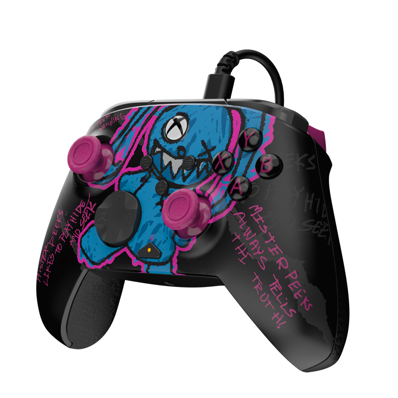 Call of Duty-Fans auf der Xbox können ihr Gameplay mit dem Designed for Xbox REMATCH GLOW Advanced Wired Controller in der Mister Peeks Edition aufwerten. Dieser kabelgebundene Controller mit Call of Duty-Thema präsentiert ein lustiges, im Dunkeln leuchtendes Design mit dem blauen Mystery-Box-Hasen Mister Peeks. Der Controller ist außerdem über die PDP Control Hub App anpassbar und bietet echte 2-Wege-Haartrigger-Funktionalität.