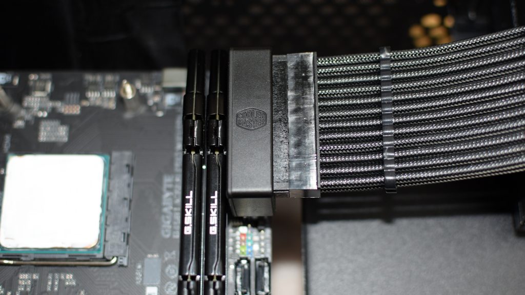 Wir haben glücklicherweise zwei zur Verfügung gestellt bekommen und können die Qualität der Adapter bestätigen. Verbaut wurde der Cooler Master 90° Adapter in unserem Test-System mit einem AORUS B450 WIFI ITX und einer Ryzen AMD CPU. Der Platz neben dem G.Skill Arbeitsspeicher mit Kühler ist ausreichend. Ein direkter Kontakt besteht zwischen dem Ram und des 90° Adapters nicht. Die Verarbeitung ist sauber und stabil. An den Kanten sind uns keine Grade oder Fehler aufgefallen. Die Adapter sorgen zuverlässig für die Weiterleitung des Stroms, werden nicht warm und bieten eine saubere Optik.