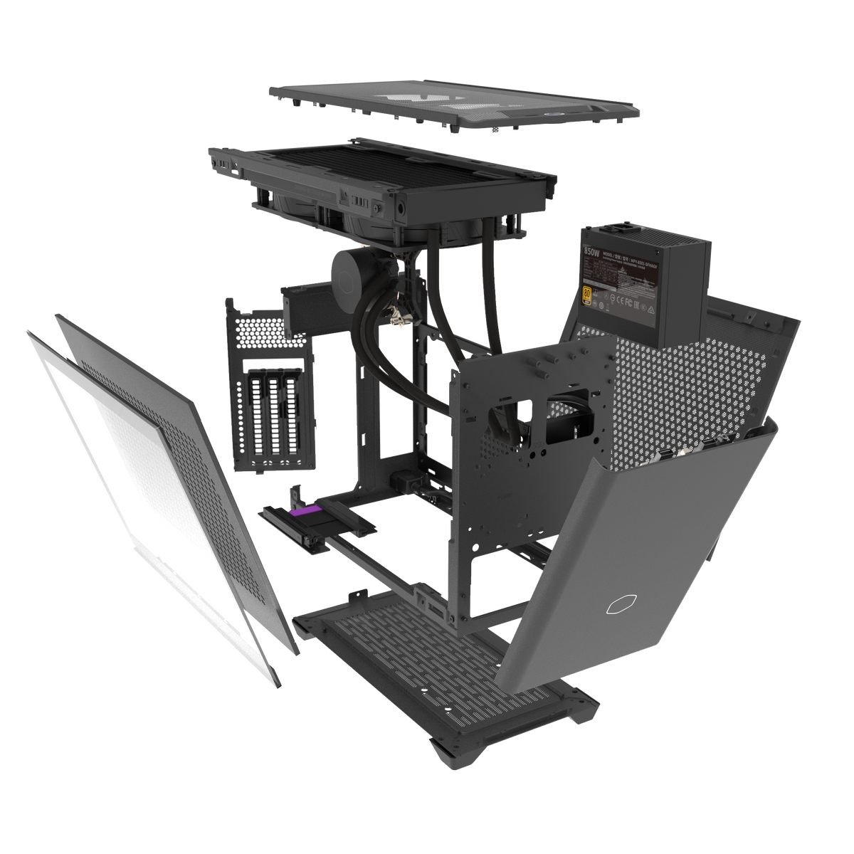 Die MasterBox NR200P MAX kommt in der Farbe Schiefergrau und bietet ein modernes, unauffälliges Erscheinungsbild. Es ist eines der benutzerfreundlichsten und vielseitigsten SFF-Gehäuse auf dem Markt. Obwohl es auf den ersten Blick Ähnlichkeiten mit der höchst erfolgreichen MasterBox NR200(P) aufweist, verfügt die MasterBox NR200P MAX über ein exklusives Gehäuselayout mit einem im Deckel vorinstallierten 280-mm-Radiator sowie einem 80-Plus-Gold-zertifizierten 850-Watt-Netzteil, deren Kabel bereits vorinstalliert und vorverlegt sind. Die Kühlung sowie die Netzteilkabel wurden dabei für optimales Aussehen und eine mühelose, zeiteffiziente Installation bereits an die optimalen Längen angepasst.