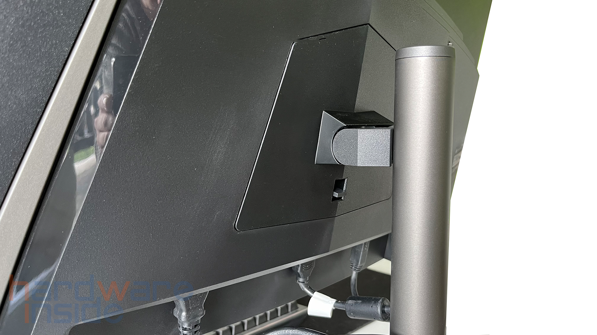 Obwohl die Anschlussleiste nicht von einer Blende begleitet wird, können alle Kabel des GM34 gut durch die Klammer am Standfuß gebündelt werden. Optisch macht es für den User schließlich keinen Unterschied, da die Kabel auf diese Weise nur sichtbar werden, wenn man hinter dem Monitor steht. Vor dem Monitor wirkt alles weiterhin absolut aufgeräumt, wie man später auf den ein oder anderen Bildern erkennen kann.