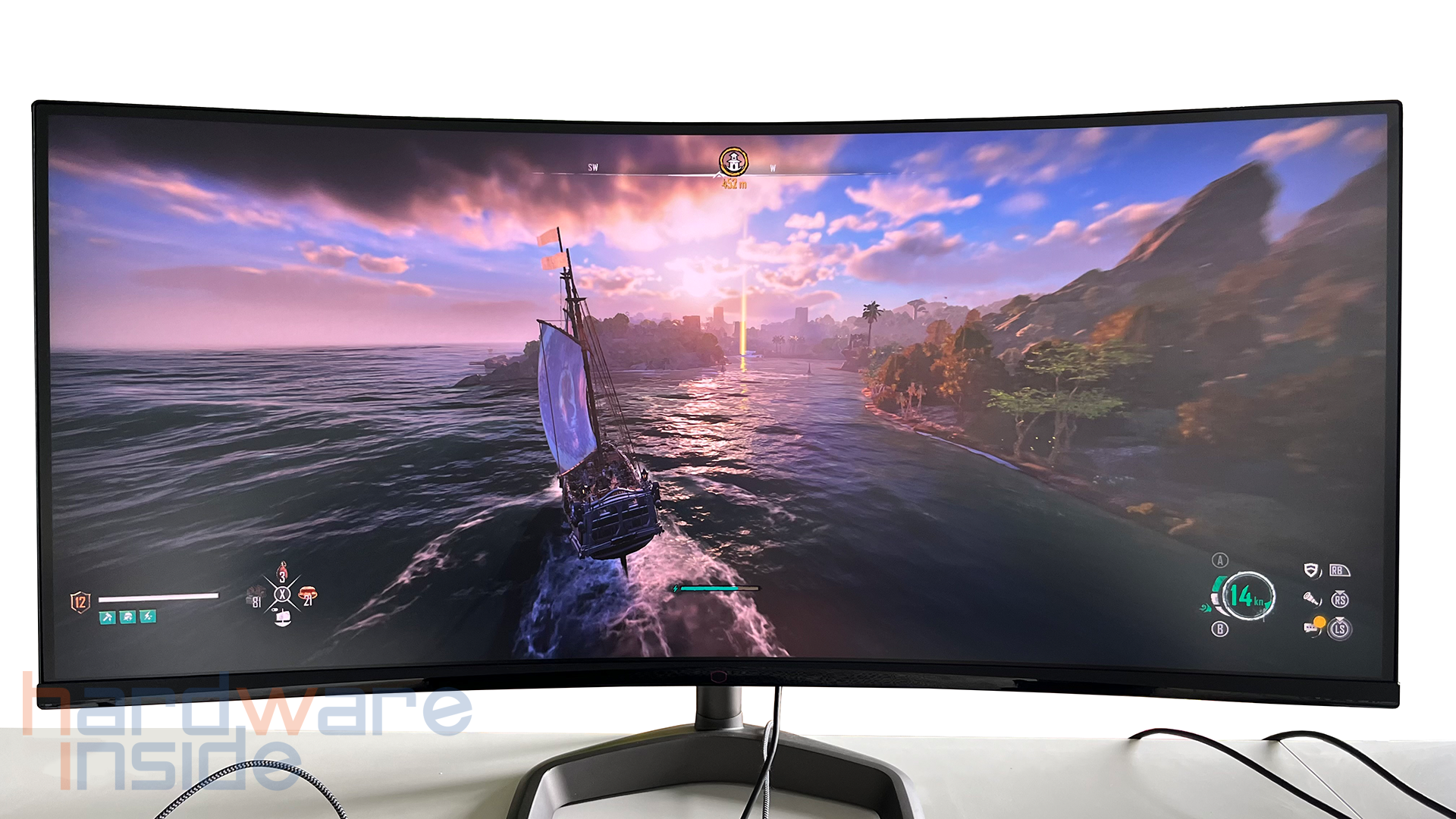 Die ersten Bilder während einer Partie „Skull and Bones“ erweisen sich als eindrucksvoll. Die Beleuchtung im Sonnenbereich wirkt heller als jene im Schattenbereich wie beispielsweise an den unteren beiden Ecken. Schnelle Bilder können gut wiedergegeben werden, doch entfaltet diese Eigenschaft ihr volles Potenzial erst mit dem „Gaming-Modus“. Die Kontraste sind ebenfalls im Game trennscharf zu erkennen. Dank HDR gefallen uns die Farben in der gesamten Bandbreite sehr gut, auch wenn dies nicht optimal durch den Rotstich des Sonnenuntergangs in dieser Szene hervorgeht. Andere Games wie z. B. Manor Lords liefern eine höhere Farbenvielfalt und somit auch eine wunderschöne Kulisse und Räumlichkeit.