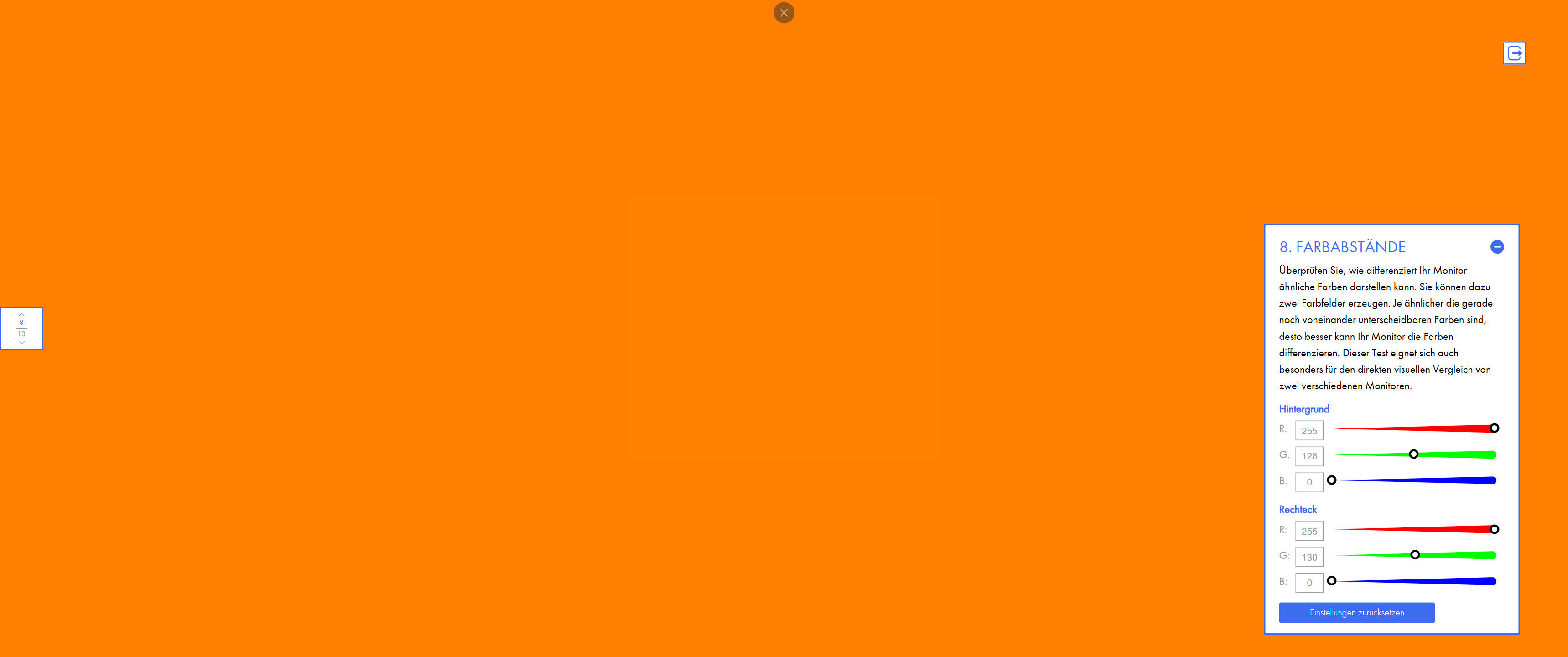 Weiter überprüfen wir, wie differenziert der Cooler Master GM34 -CWQ2 Curved Gaming Monitor sehr ähnliche Farben abbilden kann. Dazu vergleichen wir innerhalb von zwei Farbbereichen zwei sehr ähnliche Farben, indem wir die Farbe des inneren Bereichs um einen RGB-Wert verändern und überprüfen, ob wir die Farbdifferenz noch mit bloßem Auge erkennen. Falls ihr an eurem Monitor keinen viereckigen Bereich in der Mitte erkennt, der nur etwas heller ist, als der Rest, ist der Cooler Master GM34 durchaus eine Überlegung wert. Schließlich identifizieren wir in diesem Bereich, neben der schnellen Bildwiederholungsrate eine echte Stärke dieses Geräts. Eine visuelle Unterscheidung dieser ähnlichen Farben können wir ab einer Farbdifferenz von +/- 2 Skalenwerten der RGB-Skala erkennen