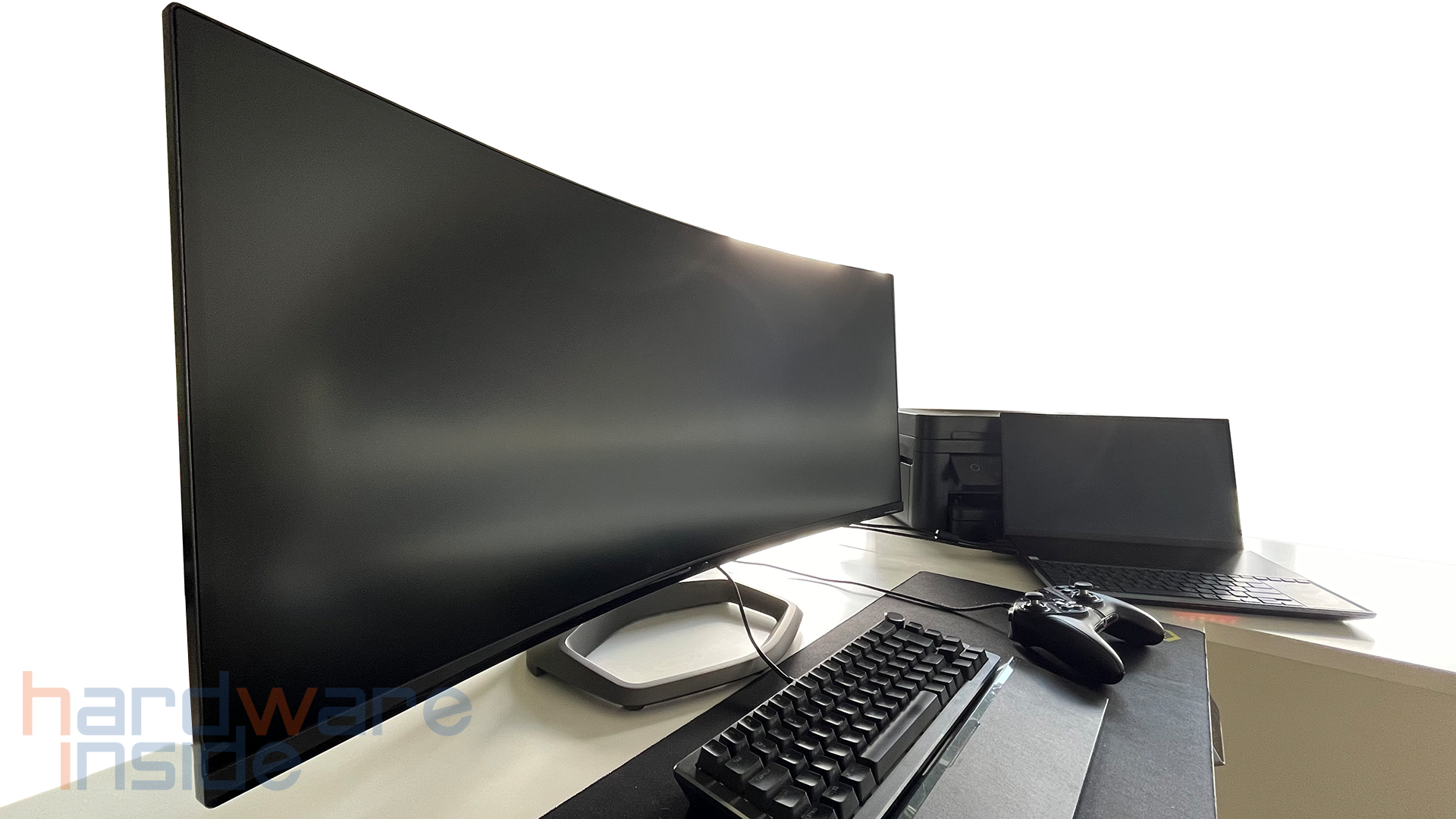 Kommen wir nun zum Praxisteil dieses Reviews. Wir verwenden den Cooler Master GM34 -CWQ2 Curved Gaming Monitor ausschließlich zum Zocken als Erweiterung für unser Asus Zenbook Pro Duo. Dazu schließen wir den Monitor via HDMI-Kabel und USB-Kabel an, um zusätzlich Tastatur und Game-Controller direkt am Monitor nutzen zu können.
