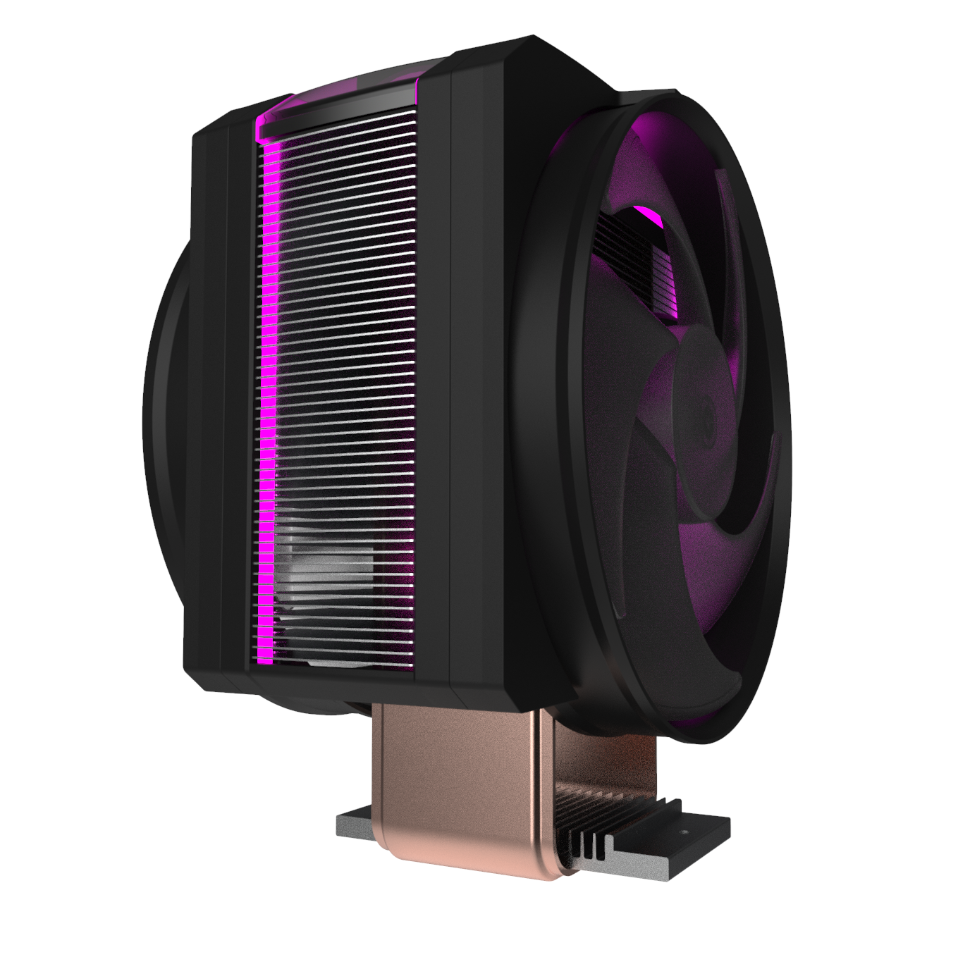 Der MasterAir Maker 3DVVC wird mit der 3D-Vertikaldampfkammer von Cooler Master erstellt. Anstelle der herkömmlichen Heatpipes, um die Wärme von der CPU abzuleiten, verwendet dieser Kühler eine einzige Einheit einer 3D-Vertikaldampfkammer. Die vapor chamber ist in eine U-förmige Konfiguration geformt, um die CPU-Wärme gleichmäßig auf die Aluminiumlamellen zu verteilen, die durch zwei 140mm-Lüfter gekühlt werden.