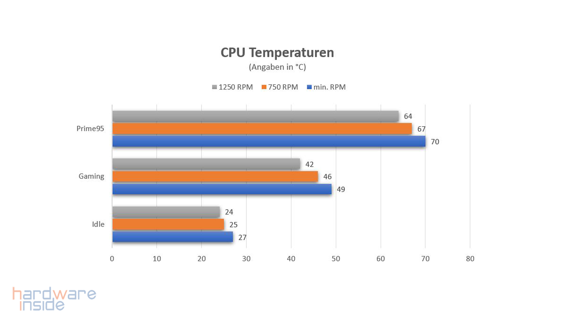 Die Temperaturen im Inneren des Gehäuses sind für uns natürlich auch ein wichtiges Kriterium. Die Lüfter wurden so kalibriert, dass eine ausreichende Kühlleistung vorhanden ist, aber zugleich kein Aufheulen der drei verbauten Gehäuselüfter zu vernehmen ist. Wir haben versucht, einen guten Kompromiss aus Leistung, Kühlung und Airflow zu finden. Getestet wurde im Idle (Surfen, YouTube ) und beim Gaming kam FORZA HORIZON 5 für 30 Minuten zum Einsatz. Zum Ende lassen wir Prime95 ohne AVX, ebenfalls für eine Dauer von 30 Minuten laufen. Die Temperaturen sprechen für sich, unsere eingestellte Lüfterkurve brachte unsere ASUS ROG STRIX GTX 1070 TI mit 46 Grad nicht zum Schwitzen und das System insgesamt war angenehm leise. Abhängig davon sind die erreichten Werte unsererseits Ist-Werte und können natürlich abweichen, je nach verbauter Hardware und auch Kühlung.