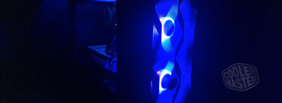 Rückseitig verbaut Cooler Master einen ARGB-PWM-Hub der mit max. fünf ARGB- Lüftern oder vier PWM-Lüftern inkl. dem Controller angesteuert werden kann und seinen Strom über einen SATA-Anschluss bezieht. Im Lieferzustand sind bereits zwei der PWM- und zwei ARGB-Anschlüsse belegt. Die adressierbaren LEDs der verbauten Lüfter können so über den Hub gesteuert werden, was eine Vielzahl von Effekten beinhaltet.