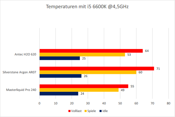 Dank Cooler Masters Innovationen im Bereich der Radiatorfinnen, und der Pumpe/Kühlblockkonstruktion liegen die Temperaturen in einem für eine AiO sehr gutem Bereich, und sind sogar vergleichbar mit einigen DiY – Lösungen.