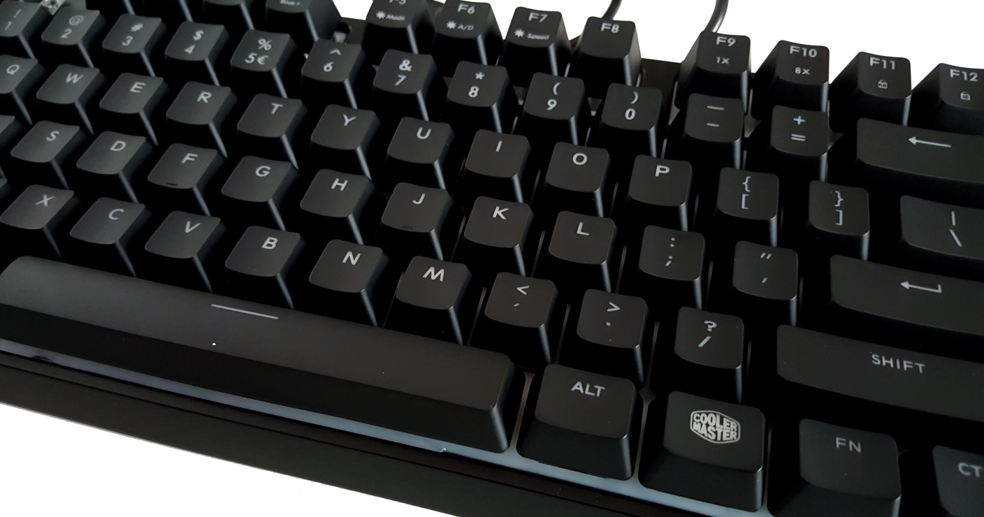Jede Taste besteht aus fünf Teilen, der Tastenkappe, dem Betätigungs-Stift, dem Gehäuse und zwei Federn. Die Betätigung entsteht durch den Stift, der bei dem drücken auf einen Schalter, auf die Folie im Inneren der Tastatur trifft. Die beiden Federn sorgen für das fühlbare und hörbare Feedback. An den Tastenkappen ist praktisch, dass diese gegen Tasten aus dem Zubehör ausgetauscht werden kann. Es gibt viele verschiedene Tastenkappen aus verschiedenen Materialien von diversen Herstellern. Auch Cooler Master bietet Tastenkappen an.