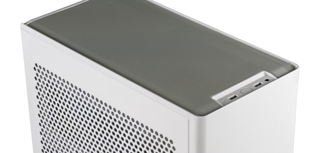 Die Oberseite wird von einem Mesh-Material abgedeckt. Diese kann ohne Werkzeug nach oben hin abgenommen werden und dient später als Staubschutz. Im vorderen Bereich ist das Front I/O untergebracht. Es besteht aus einen Ein-/Ausschalter, zwei USB-Anschlüssen sowie einer kombinierten 3,5 mm Audio-Klinke und einem Reset-Taster. Die Vorderseite besteht aus matt weiß lackiertem Stahl. Die Lackierung ist sauber ausgeführt und fühlt sich sehr geschmeidig an. Im unteren Bereich hat der Hersteller das bekannte Cooler Master Hexagon aufgebracht. Die Front lässt sich mit sanfter Gewalt entfernen. Hier bietet sich dann die Möglichkeit zwei 2,5″ Laufwerke zu montieren.![]()