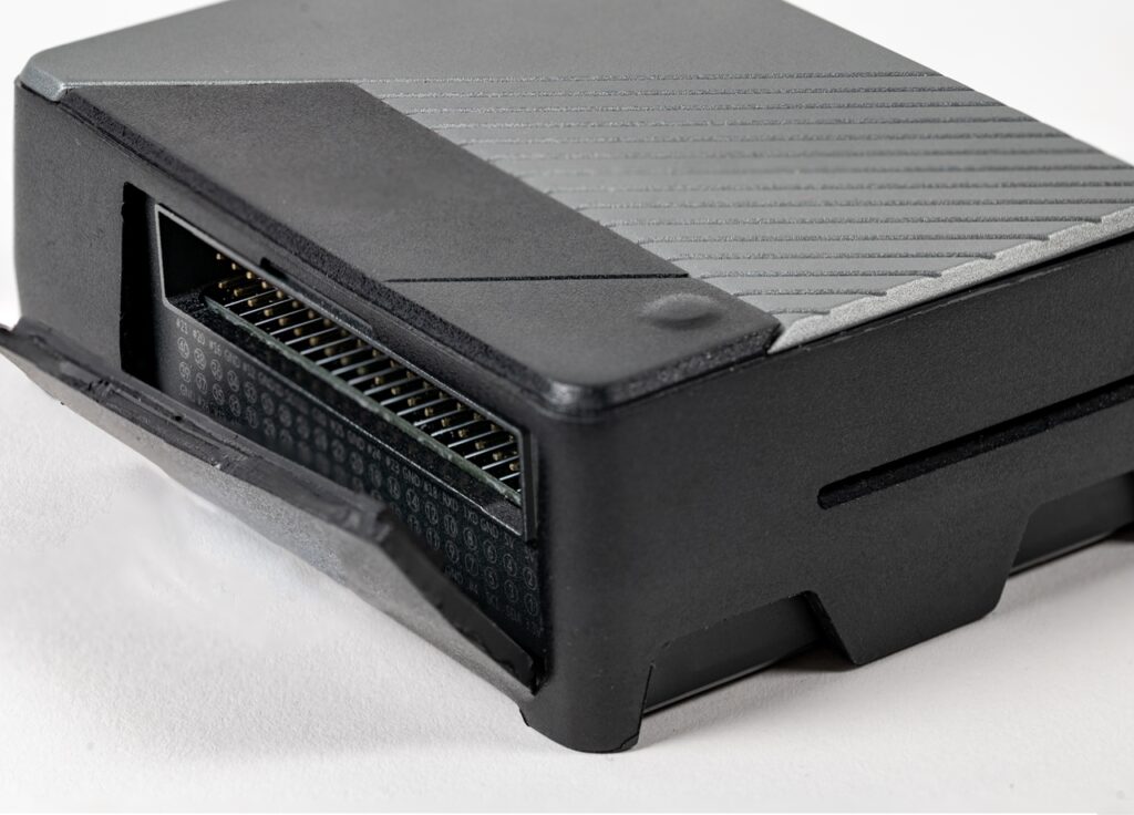 Leicht zugängliche E/A-Ports – Alle Ports sind dank eines störungsfreien Designs schnell zugänglich. Die GPIO-Ports sind um 90 Grad gedreht und über die seitliche Klappe im TPU-Stoßfänger zu erreichen, sodass sie im geschlossenen Zustand geschützt und im geöffneten Zustand leicht zugänglich sind. Display- und Kameraanschlüsse bleiben innerhalb des Gehäuses geschützt, während ein Schlitz im TPU-Stoßfänger die Führung beider Kabel außerhalb des Gehäuses ermöglicht.