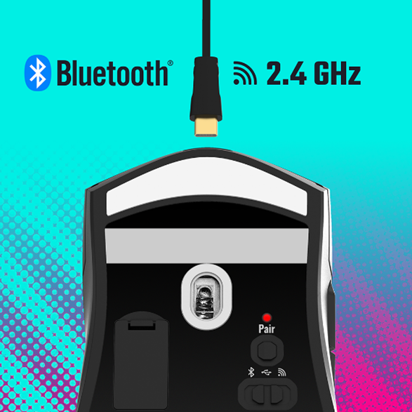Hybrid Wireless Technologie – Die MM712 bietet sowohl kabelgebundene als auch kabellose Funktionalität. Kabelgebundene Type-C-Konnektivität oder eine kabellose Variante: 2,4 GHz für nahezu verzögerungsfreie Eingaben oder Bluetooth 5.1 für eine einfache, bequeme Verbindung mit einer effektiven Reichweite von bis zu 10 Metern. Diese Kombination aus kabelgebundener Leistung und kabellosem Komfort macht die MM712 zu einer idealen Maus für Arbeit und Freizeit.