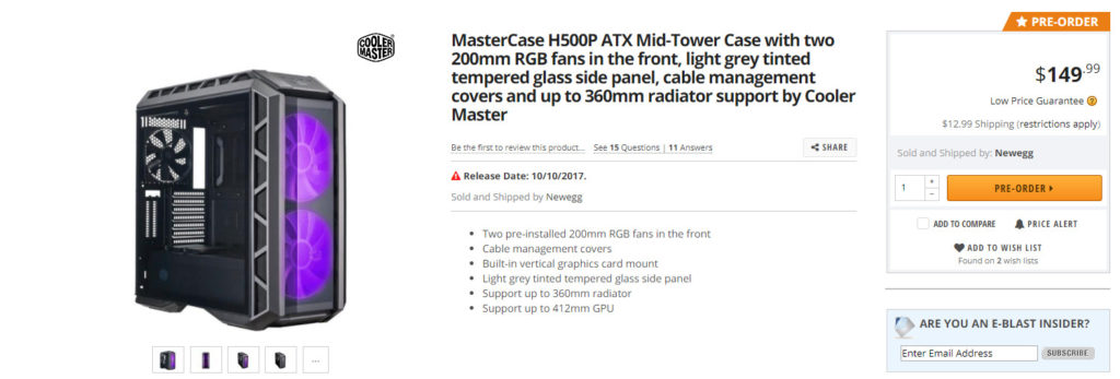 Nach einer Produktliste auf Newegg scheint ein Release des MasterCase H500P ATX Gehäuses am 10. Oktober wahrscheinlich. Das Gehäuse wurde erstmals auf der diesjährigen Computex der Welt vorgestellt und gilt als Nachfolger des Cooler Master HAF (High-Air-Flow). Das Gehäuse soll zwei 200 mm Lüfter mit RGB-Beleuchtung auf der Front beinhalten.