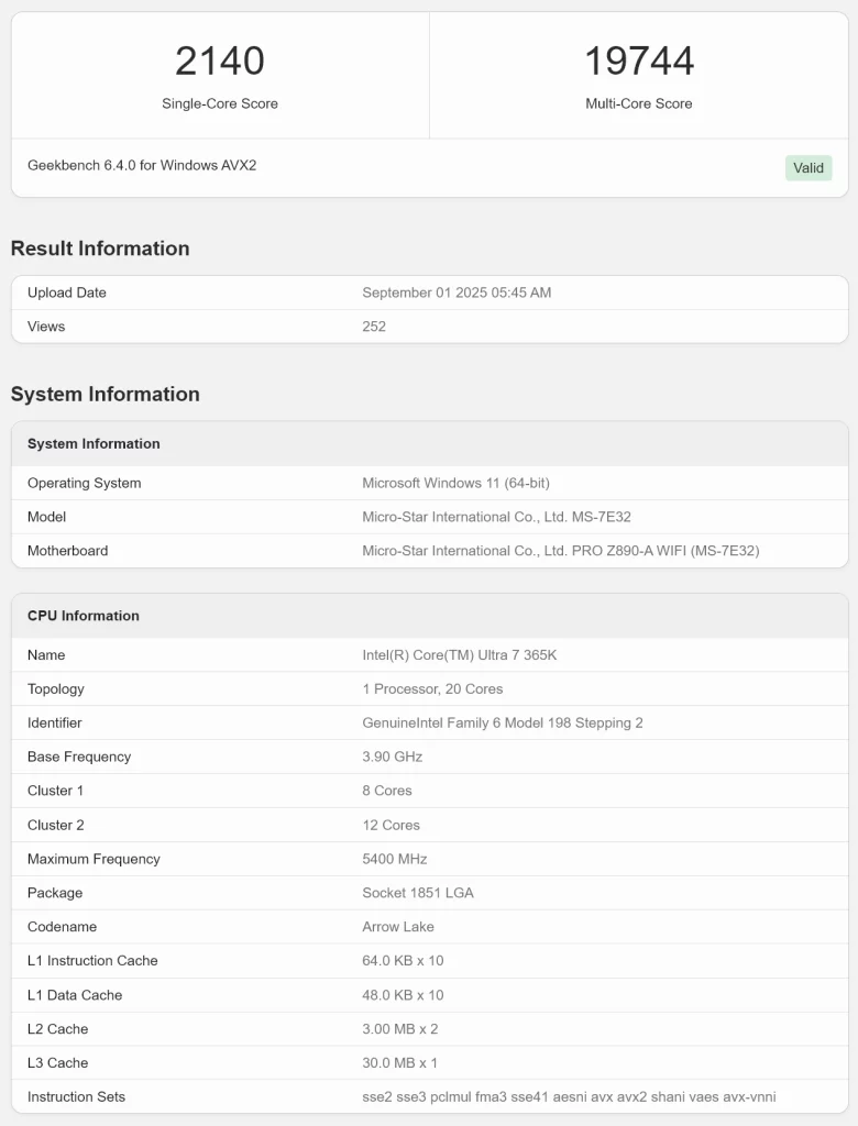 Die Ergebnisse: Der Core Ultra 7 365K erreicht 2.140 Punkte im Single-Core- und 19.744 Punkte im Multi-Core-Benchmark. Damit liegt er noch unterhalb des aktuellen Core Ultra 7 265K, der im Schnitt auf 3.030 Single-Core- und 20.861 Multi-Core-Punkte kommt. Die niedrigeren Werte lassen sich vermutlich darauf zurückführen, dass es sich um ein Engineering Sample handelt. Mit finaler Hardware und optimierter Firmware dürfte die Leistung näher an – oder sogar über – den bestehenden Arrow-Lake-Prozessoren liegen. Interessant ist zudem, dass der Benchmark dieselbe CPU-Familie und Stepping-ID wie Arrow Lake ausweist, allerdings mit einer abweichenden Modellkennung (8 statt 9). Die L2- und L3-Cache-Konfigurationen bleiben unverändert.