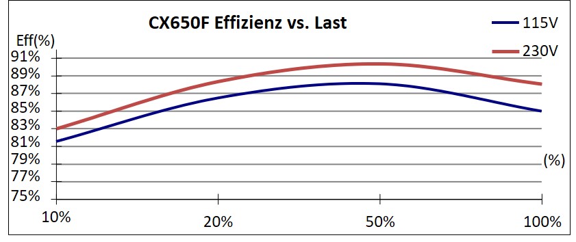 Die beste Effizienz erreicht das Corsair CX650F RGB bei einer Auslastung von rund 50 %. Mit der 80+ Bronze Zertifizierung ergibt sich somit eine Effizienz von 90,39 % bei 50 % Auslastung. Das von uns eingesetzte Testsystem verbraucht unter Volllast 405 Watt. Im Bereich Gaming liegt der Strombedarf bei 280 Watt, womit wir recht nahe an den Sweetspot dieses Netzteils gelangen. Unser Energiemessgerät (Brennenstuhl PM231 E) zeigt im Gaming einen 302 Watt an, welche das Netzteil aus der Steckdose bezieht. Zur besseren Veranschaulichung zeigen wir euch im Folgenden noch eine Tabelle, welche das obige Diagramm ergänzen soll.