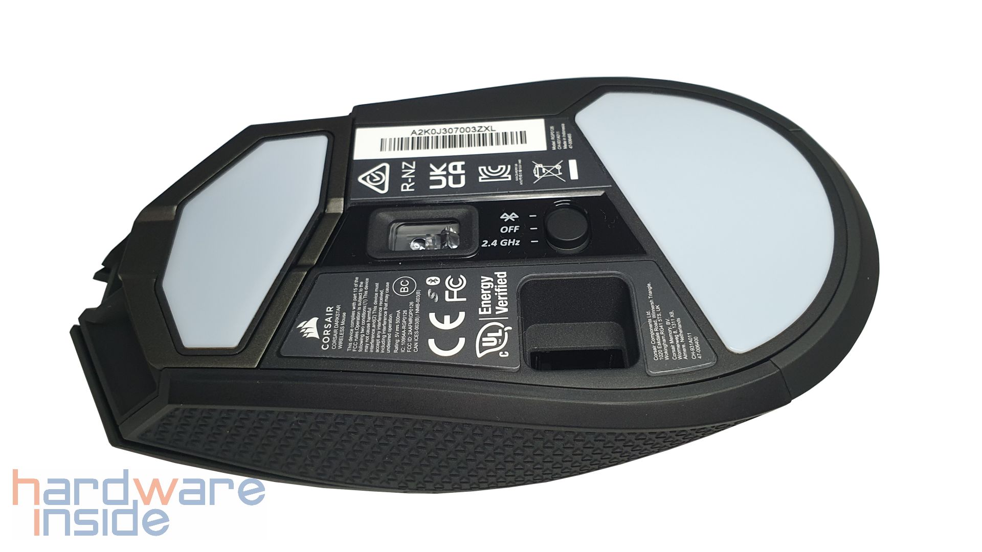Der angeraute Überzug ist nötig und hilfreich zur Bedienung der Maus, denn die Corsair Darkstar Wireless Gaming Mouse hat Neigungssensoren, die in der Praxis wichtig werden. Bei einer Neigung der Maus sind die zwei PTFE-Pads an der Unterseite zu erkennen, die als Füße funktionieren. Neben dem Corsair Marksman 26K Sensor ist ein Schalter zu finden, der zwischen den Verbindungen Bluetooth, 2,4-GHz-USB-Dongle und AUS für eine Kabelverbindung schaltet. Unter dem Schalter befindet sich eine Aussparung für den mitgelieferten USB-Dongle. Dieser sitzt ziemlich tief und ist relativ schwierig zu entfernen, ist dafür aber sicher platziert.
