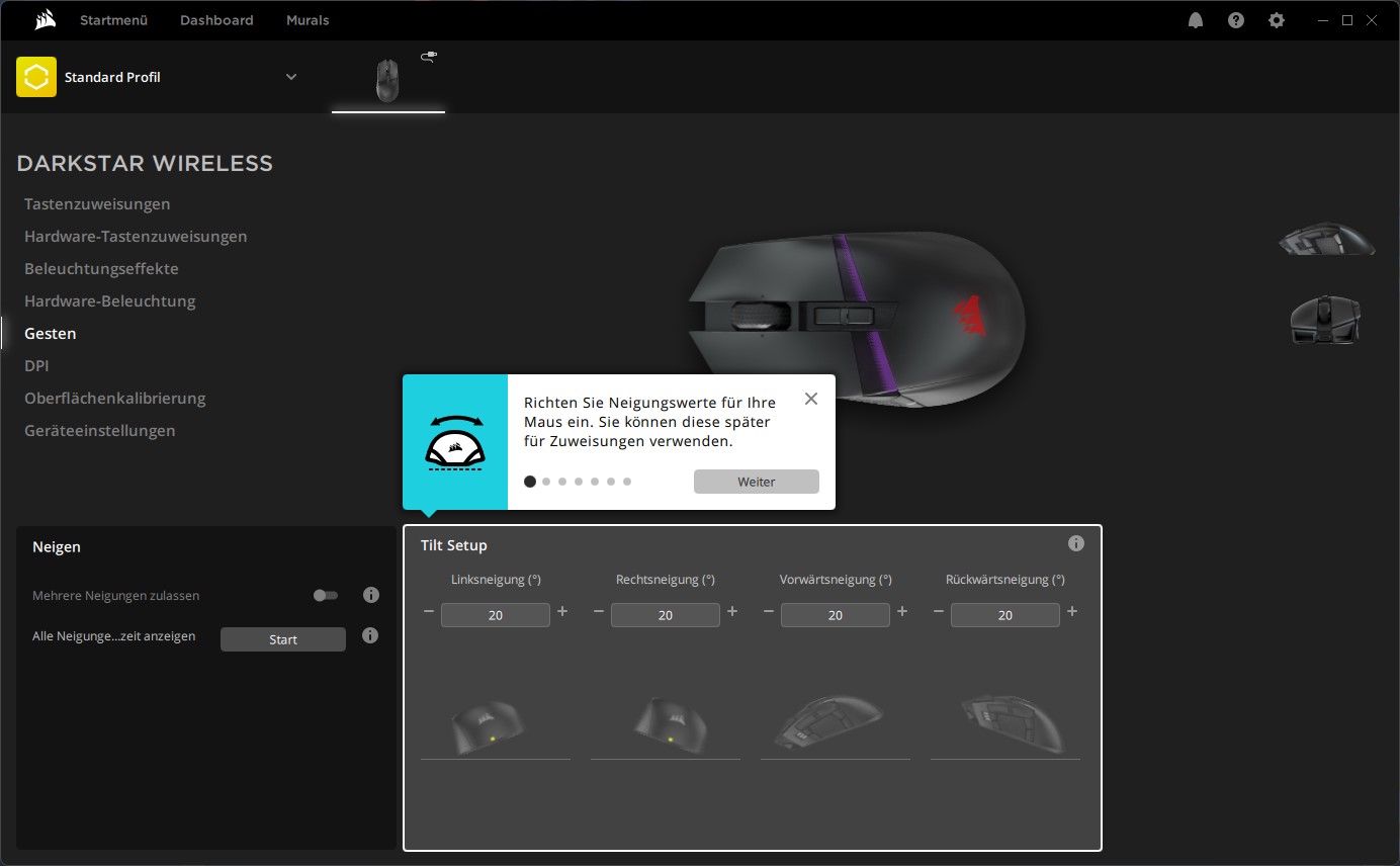 Mit der Einführung des 6-Achsen-Bewegungs-Sensors auf der Corsair Darkstar Wireless Gaming Mouse für die Liftoff-Detection war es möglich, mit der innovativen Technik zu experimentieren und dabei in erster Linie Makrosteuerung in 4 Neigungen (links rechts, vorne hinten) zu belegen. Von Windows-Funktionen wie Screenshots, Kopieren, Einfügen zwischen Fenstern wechseln über Gaming-Mechaniken wie Nachladen, Granaten, Heil-Gegenstände, Kommandos sind der Kreativität des Nutzers keine Grenzen gesetzt. Auch beim Arbeiten ermöglicht die Gestensteuerung neue Freiheiten und erhöht die Effizienz des Nutzers. Dies ermöglicht sogar viele Vorgänge oder Spiele komplett ohne Tastatur zu meistern. Die Gesten werden in Neigungswinkeln in der ICUE-Software kalibriert und nach Bedarf angepasst. Anschließend werden die eingestellten Neigungen mit Funktionen, Tasten oder Makros belegt. Je nach Profil wird zwischen den Funktionen schnell hin- und hergewechselt und bedient.