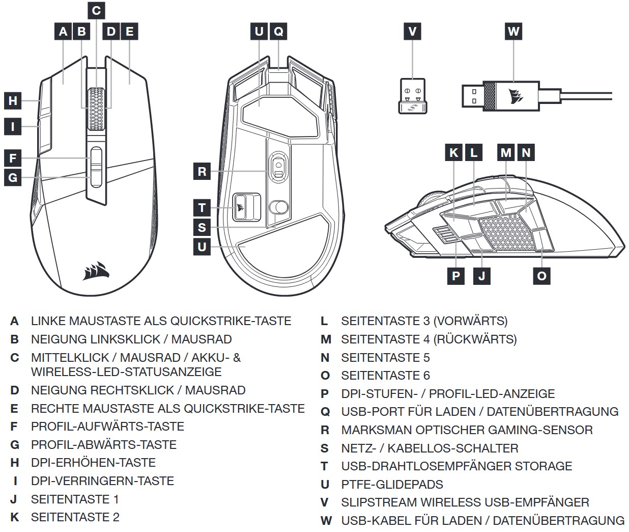 | Verbindungsmöglichkeiten | Hyper-fast, sub-1ms 2.4GHz SLIPSTREAM CORSAIR WIRELESS TECHNOLOGY, Bluetooth® 4.2 + LE |