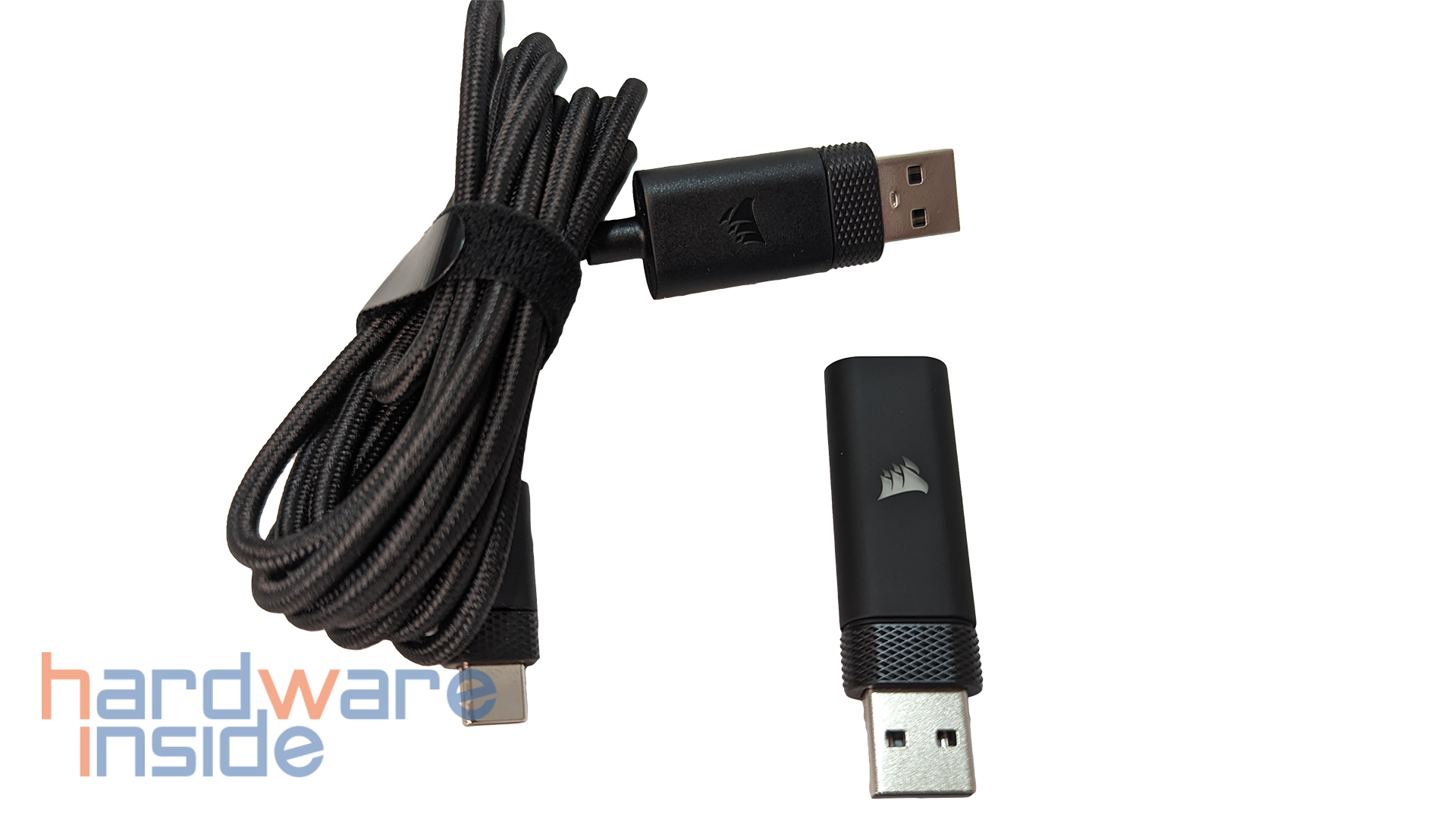 Für den Betrieb liegt ein 1,8 m langes USB-A auf USB-C Kabel bei. Beide Enden sind schön gestaltet und mit dem Corsair-Logo versehen. Der Betrieb ist nur kabellos möglich, aber wenn das Corsair HS80 MAX WIRELESS leer ist, kann das Headset während des Ladevorgangs weiter benutzt werden. Auch hier informiert uns eine Stimme, dass wir das Headset aufladen. Für den Funkbetrieb steht uns ein Dongle mit USB-A zur Verfügung, der im Corsair-Logo eine LED integriert hat, die über den Funkstatus informiert. Im aktiven Betrieb leuchtet die LED weiß, während der Kopplung blinkt diese und wenn keine Verbindung besteht, ist die LED aus.