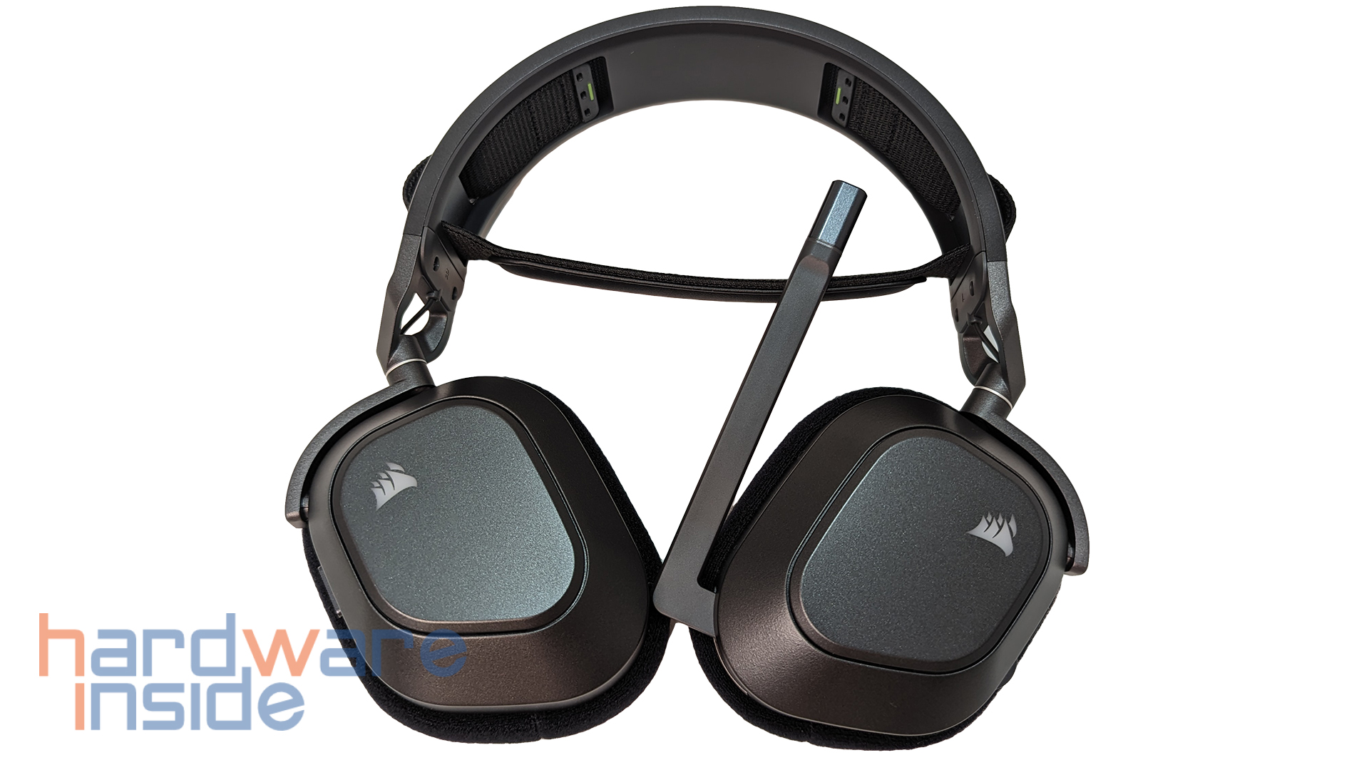 Wie bereits erwähnt, besteht die Ohrmuschelaufnahme aus Aluminium. Auf der linken Seite ist der Schriftzug „//HS80“ eingraviert. Durch die Art der Aufnahme können die Ohrmuscheln aus ihrer Ausgangsposition nach innen geneigt und gedreht werden. So passen sie sich ganz natürlich dem Kopf an und vermeiden unangenehmen Druck. Möchte man nun das Corsair HS80 MAX WIRELESS an den Kopfumfang anpassen, so muss man dies über das Kopfband, welches mit einem Klettverschlusssystem arbeitet, einstellen. Dazu löst man das mit einem grünen Streifen markierte Band zunächst auf einer Seite, stellt die neue Größe ein und befestigt die Seite wieder. Das Gleiche wiederholt man auf der anderen Seite. Einmal eingestellt, braucht man sich keine Gedanken mehr über versehentliche Verstellung zu machen. Für den Komfort am Kopf sorgt nicht nur die Druckverteilung durch das Band, sondern auch ein kleines, mit Kunstleder bezogenes Polster.