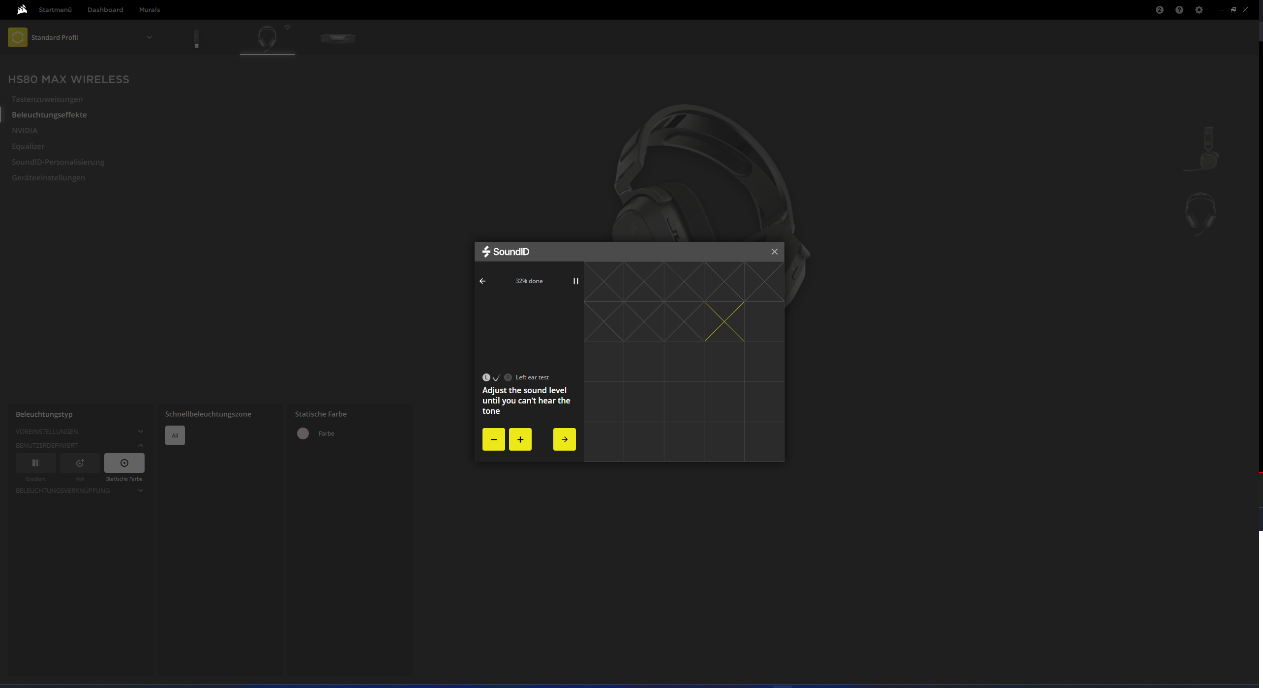 Für die Beleuchtung stehen dem Nutzer 15 Grundeffekte zur Verfügung, die jeweils in Farbe und Animationsgeschwindigkeit weiter angepasst werden können. Beide Seiten des Headsets lassen so das Corsair-Logo in der jeweiligen Einstellung aufleuchten.