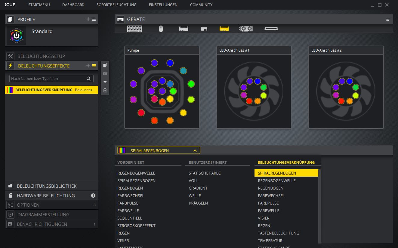 Mit Corsair iCUE stehen dem Nutzer quasi unbegrenzte Beleuchtungsoptionen zur Verfügung. Zur Wahl stehen entweder vordefinierte Farbeffekte oder man kreiert sein eigenes Farbschema. Die 33 RGB LEDs der Pumpeneinheit als auch die jeweils 8 RGB LEDs der Lüfter können komplett individuell adressiert werden.