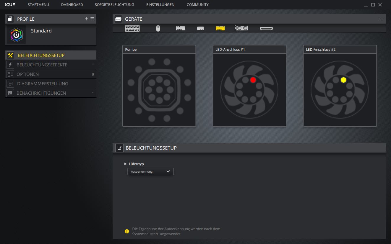 Im Beleuchtungssetup ist standardmäßig die auomatische Erkennung des Lüftertyps aktiviert. Möchte man die Lüfter wechseln oder falls es Probleme geben sollte, kann man auch manuell den Lüfter-Typ aus der Liste auswählen.