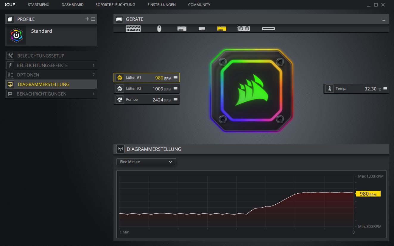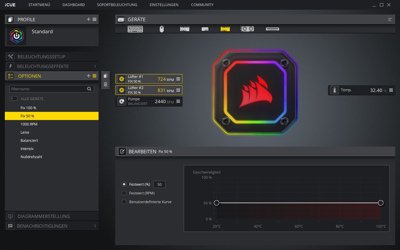 Der Abschnitt „Optionen“ bietet Einstellungsmöglichkeiten in Bezug auf die Leistung. Corsair stellt verschiedene vordefinierte Profile zur Verfügung, die der Pumpe oder den Lüftern zugewiesen werden können. Zusätzlich kann man eigene Profile (wie bei uns Fix 50 % / 100 %) anlegen. Zu beachten ist, dass die Pumpe nur auf Leise, Balanciert oder Intensiv gestellt werden kann. Für die Lüfter steht zusätzlich die Option „Nulldrehzahl“ zur Verfügung.