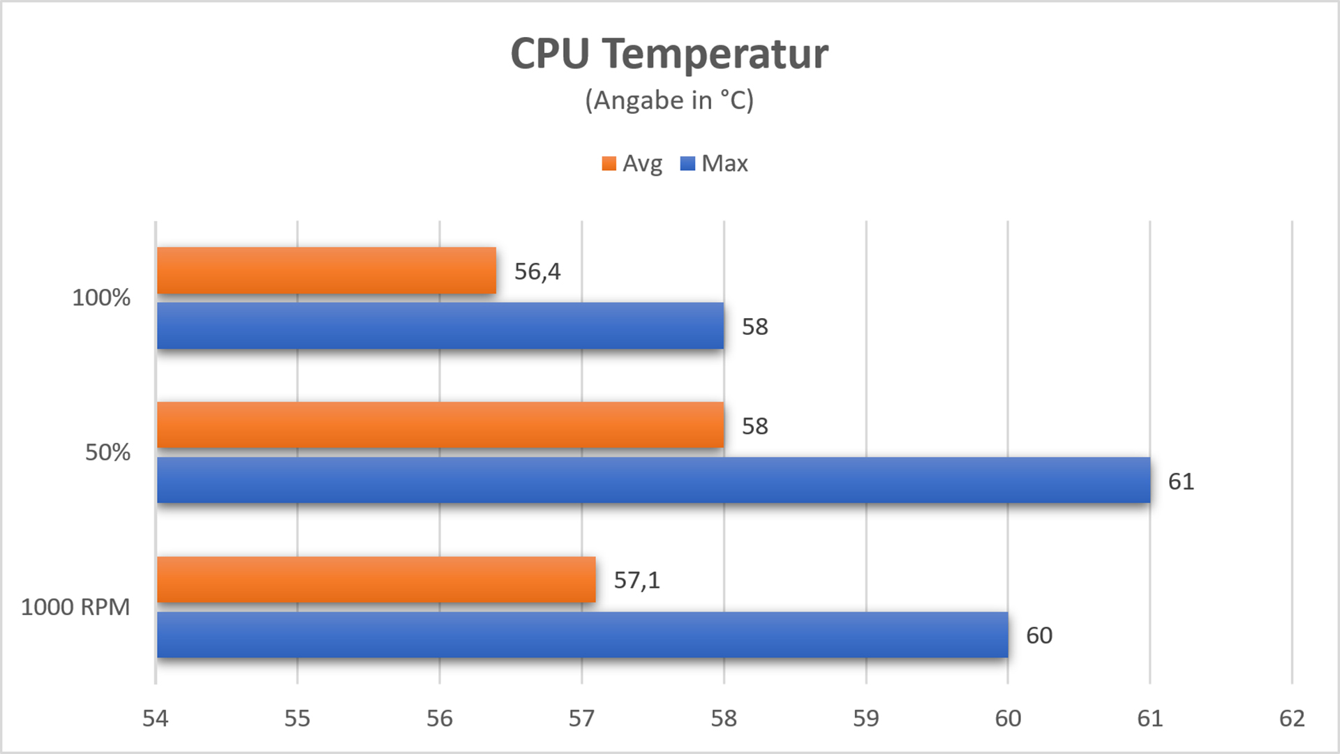 Im Normalgebrauch bei ca. 30 – 50 % Lüftedrehzahl ist die Lautstärke sehr gering und damit angenehm. Bei höheren Drehzahlen geht natürlich auch eine deutlich höhere Lautstärke einher. Für den Alltag langt die Kühlleistung bei bis zu 50 % Drehzahl allerdings im Normalfall vollkommen aus. Die Lautstärke wurde bei offenem Gehäuse in einem Abstand von ca. 30 cm gemessen.