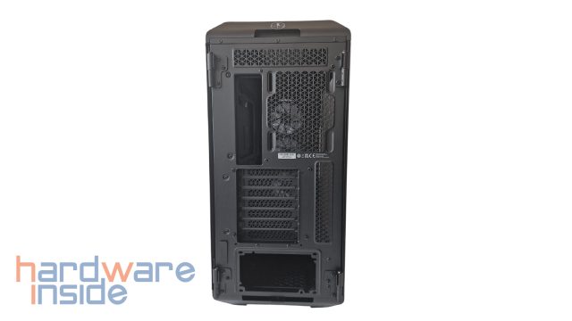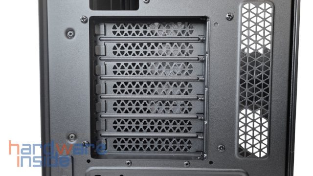 Auf der Rückseite finden wir ein gewohntes Layout für Midi-Tower. Im unteren Bereich findet das ATX-Netzteil seinen Platz, darüber folgen insgesamt sieben Slots waagerecht für Erweiterungskarten und schließlich die Aussparung für das I/O Shield des Mainboards. Die PCI-Platte kann bei Bedarf für den Einbau einer vertikalen Grafikkarte auch um 180° Grad gedreht werden.