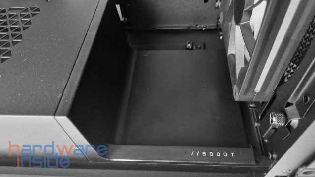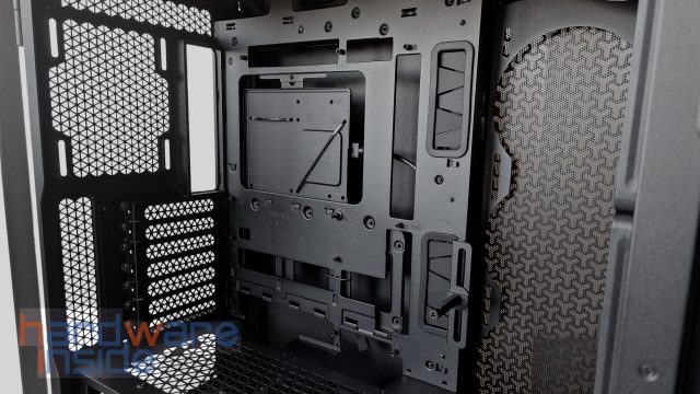 Kommen wir zum Herzstück – dem Innenleben. Der Innenraum ist in zwei Kammern unterteilt. Im oberen Bereich, wo sich das Mainboard-Tray befindet, ist barrierefrei, also ohne Laufwerkskäfige oder ähnliche Aufbauten. Rechts davon befinden sich Kabeldurchführungen mit Gummiabdeckungen. Vor diesen ist standardmäßig eine Blende angebracht, hinter der Platz für die Montage von drei 120-mm-Lüftern oder einem maximal 360 mm großen Radiator ist. Zudem gibt es großzügige Kabeldurchführungen über und unter dem Mainboard-Tray.